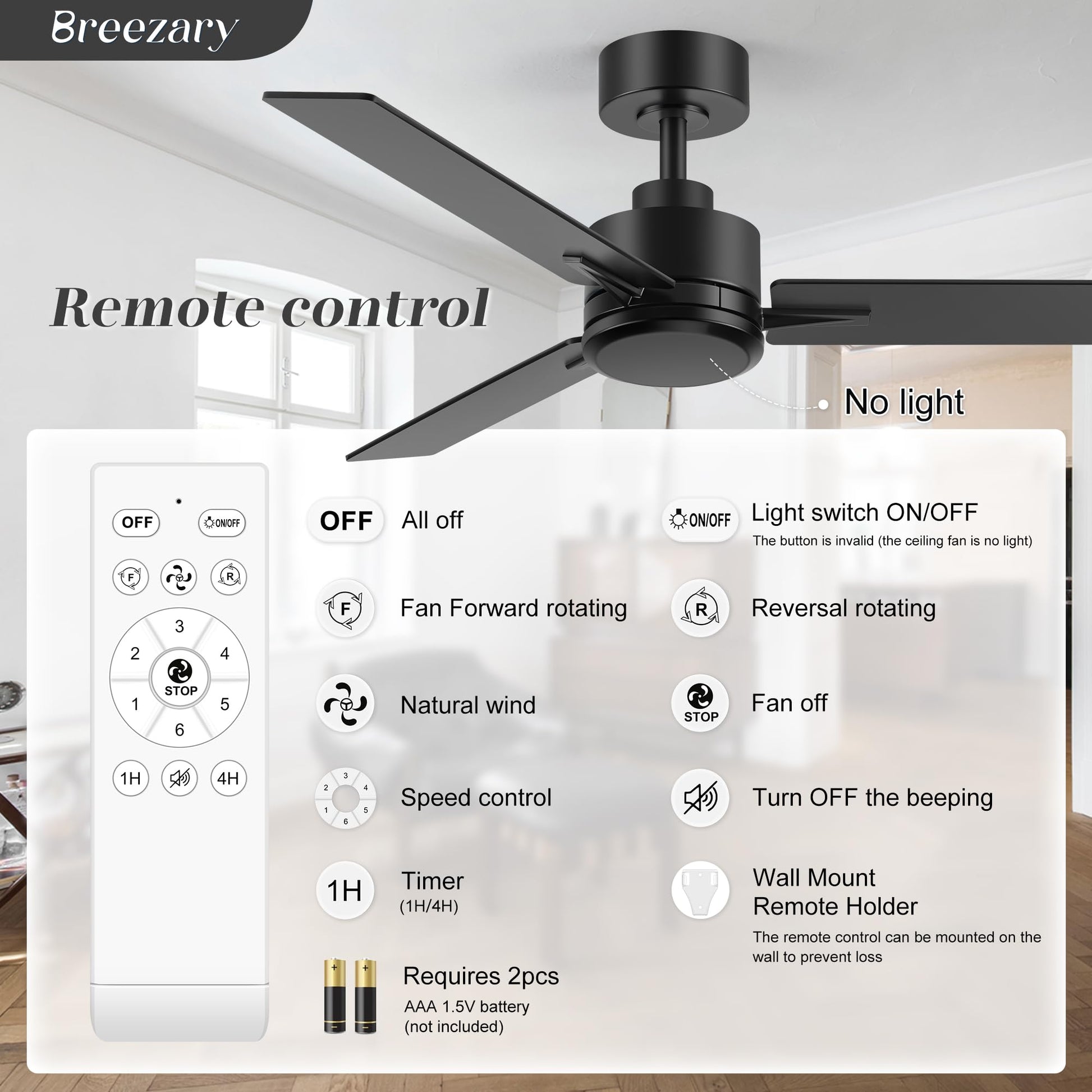 - 【Ceiling Fan without Light Remote Control】Our 48 inch ceiling fan comes with remote control. Turn the fan on/off, and you can adjust 6 wind speeds, change the wind direction, and even set a timer(1Hour/4Hour). Remote control provides effortless operation from anywhere in the room, allowing you to adjust the fan's settings without the need to get up from your seat.
