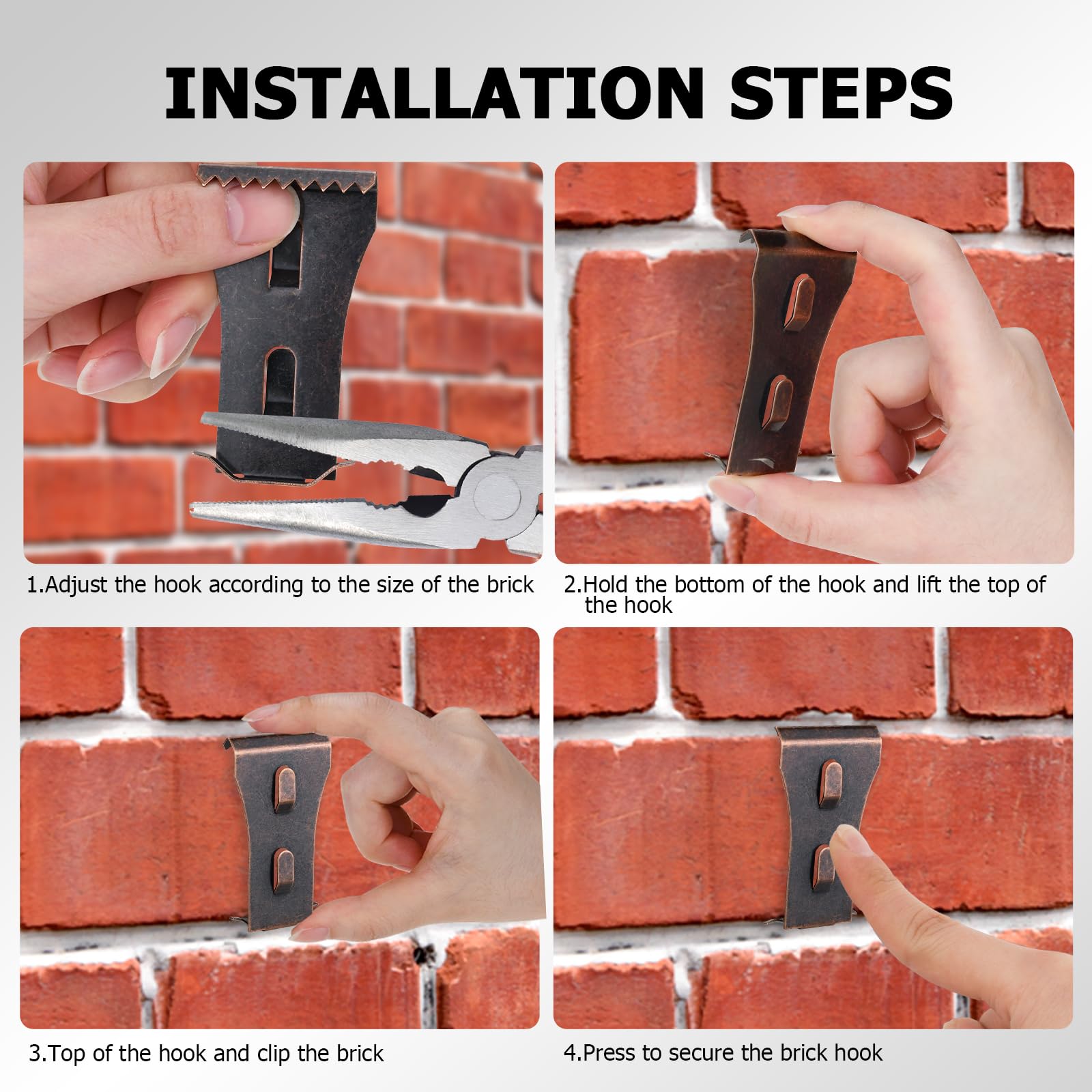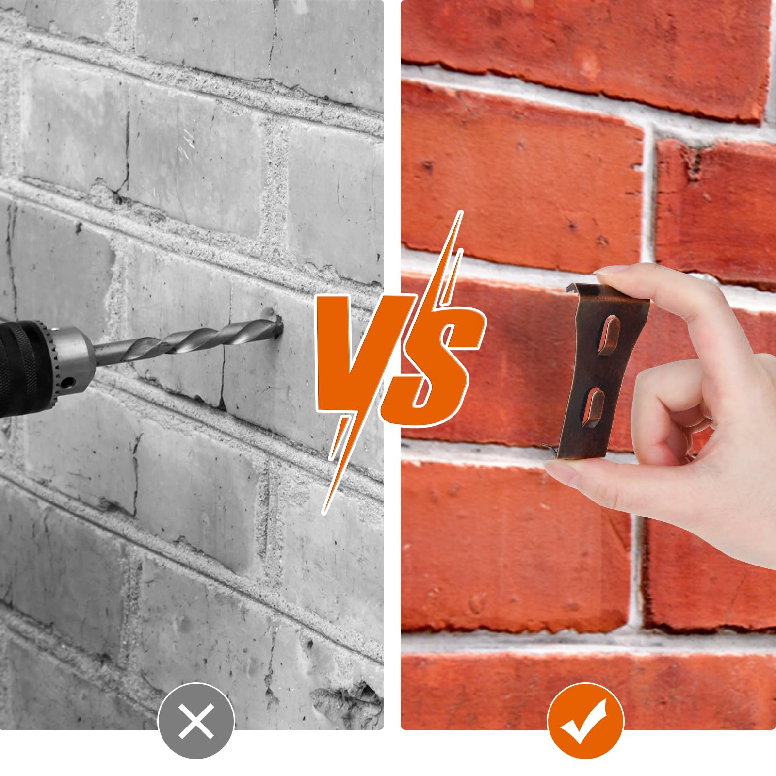 - 【Check the gap between bricks and mortar】:Ensure at least a 1/8 inch (0.3cm) gap between bricks and mortar for the brick clip to hold securely before buying. If the mortar joints are flat, extruded, or beaded, the brick hook clips will not hold securely.You need to add a slight lip edge to the brick in order to use these features.
