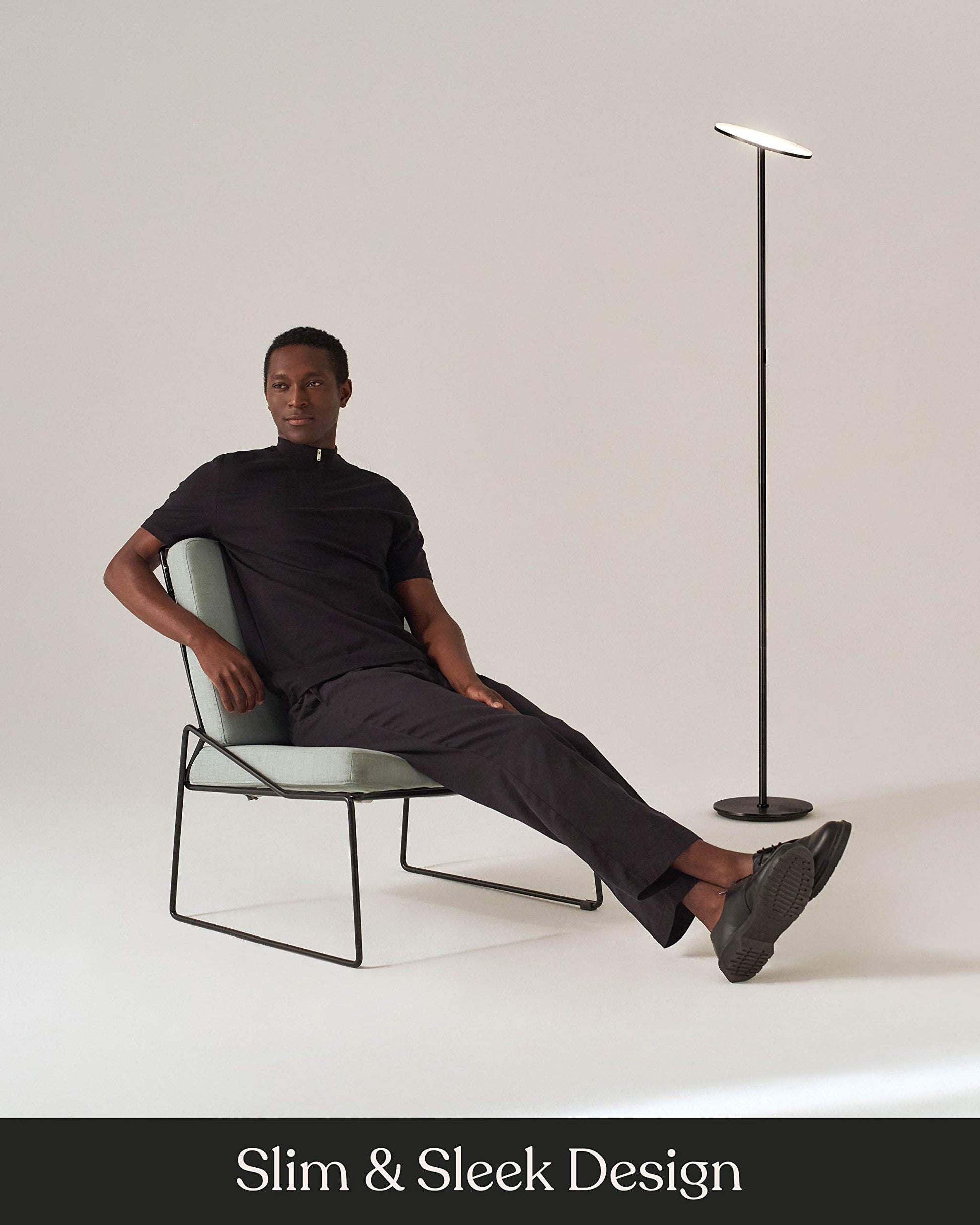 - 3-Way Dimmer and Memory Mode: The Sky complements contemporary living room decor and its body fits easily in corners. Plus, the base slides under sofas. Adjust the brightness level of this LED floor lamp with a simple touch of a button featuring three dimmer settings. The pivoting head of this tall lamp lets you angle the light for a greater illumination when desired. The standing lamp has a memory function to remember your lamp's last brightness setting and works with wall switches.