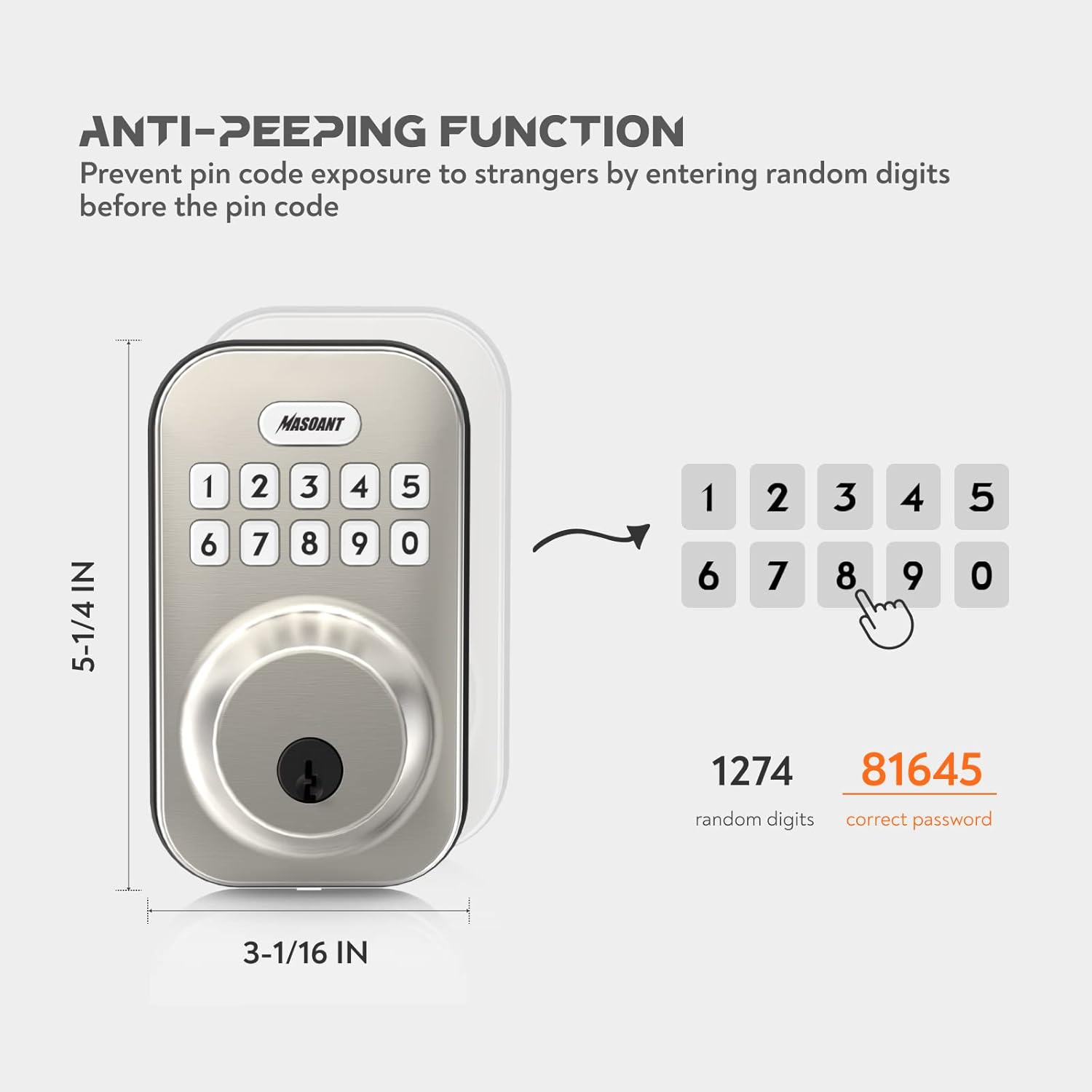 - 【High-quality and Durability】Masoant keypad door lock will never let you down, it is waterproof and can be used indoors and outdoors. Also it has so many functions as anti-peeping user password protection, silent mode, wrong entry limit and low battery indicator. It is made with sturdy lock cylinder and high-quality metal structure, so it is the best solution for the front or back door of a private house, apartment or office.