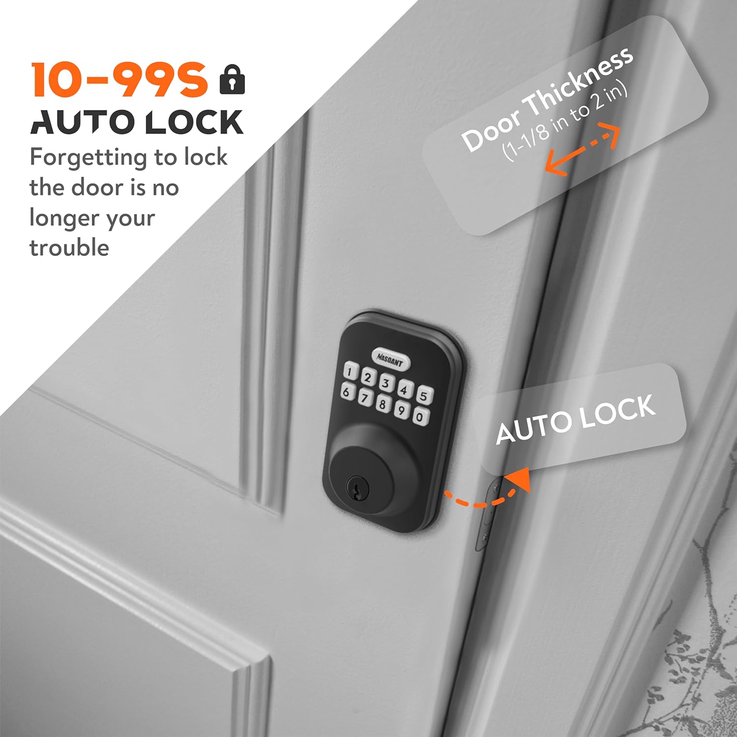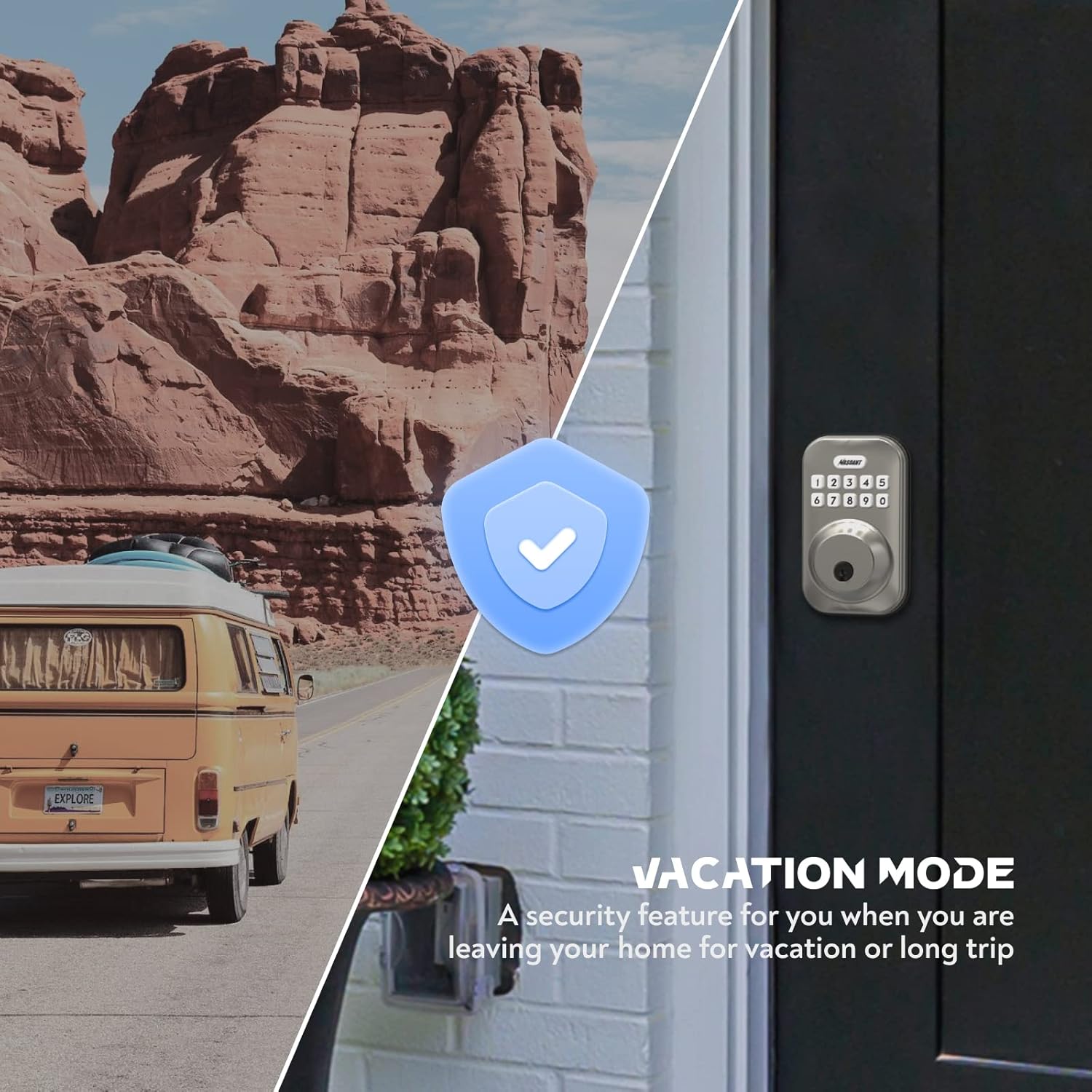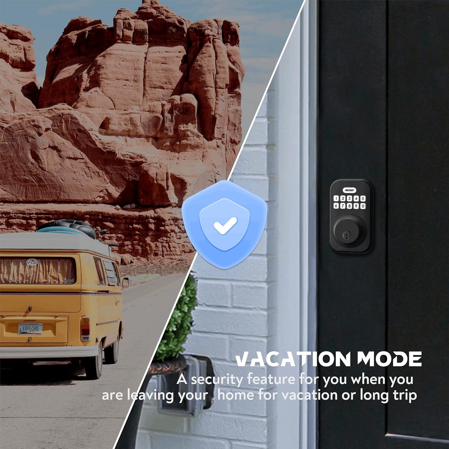 - 【Safe and Versatile】No longer need to remember to close the door, our digital door lock is able to lock automatically. Depending on your needs, you can set your lockout timer to any time between 10 and 99 seconds, or press and hold any keypad for more than 2 seconds to lock the deadbolt automatically. This superior lock has a vacation mode which is a great choice for travel, because it can restrict all user codes until master code is entered on keypad.