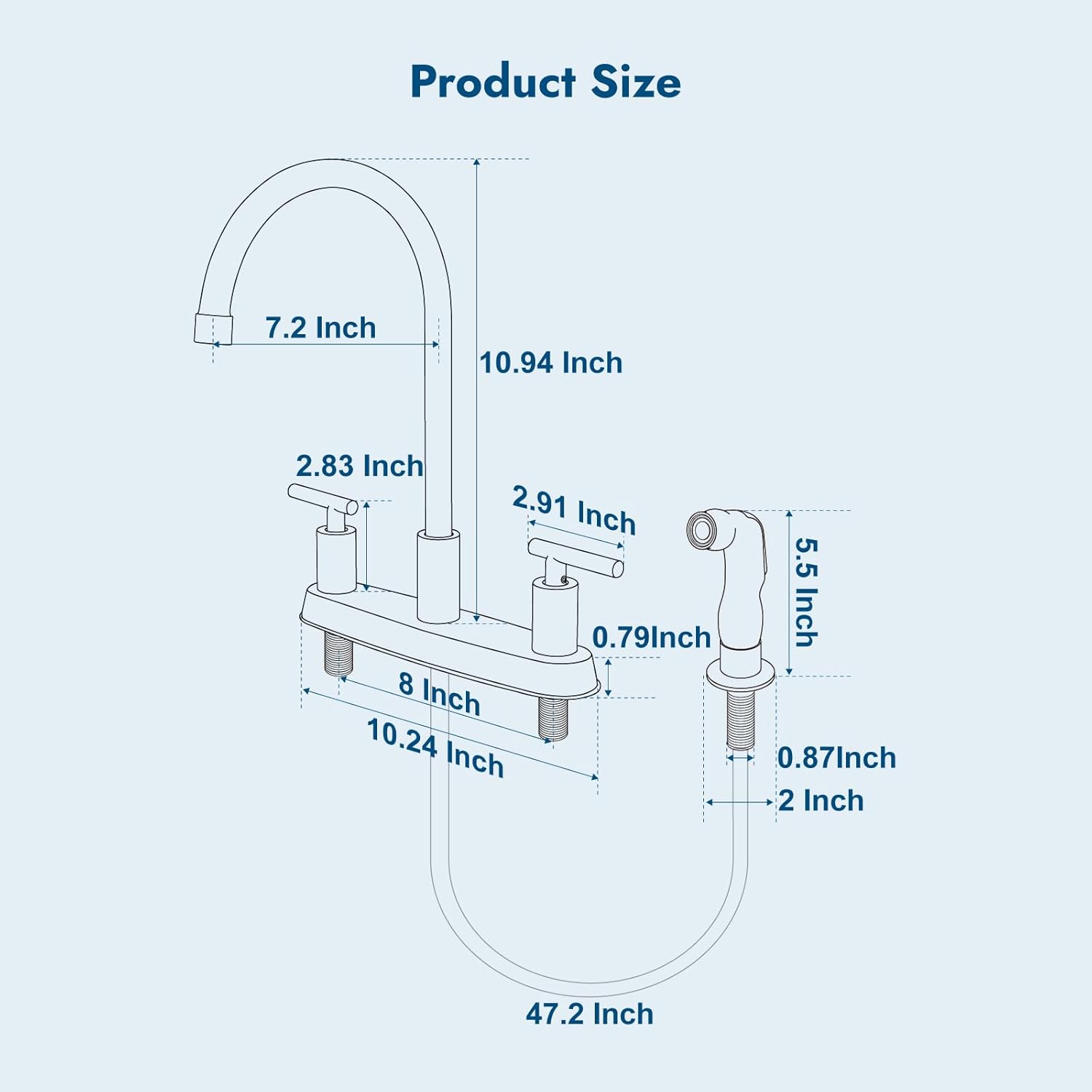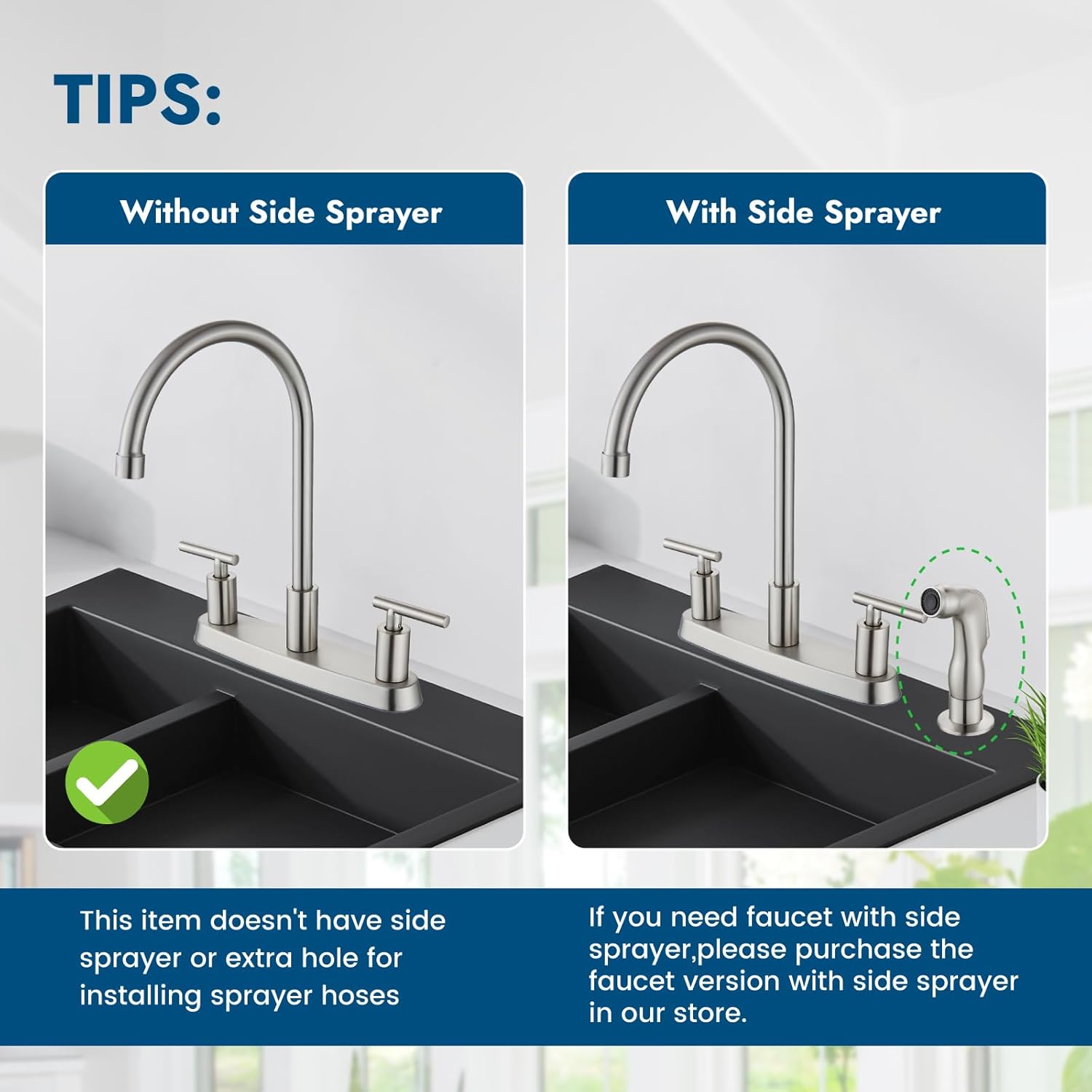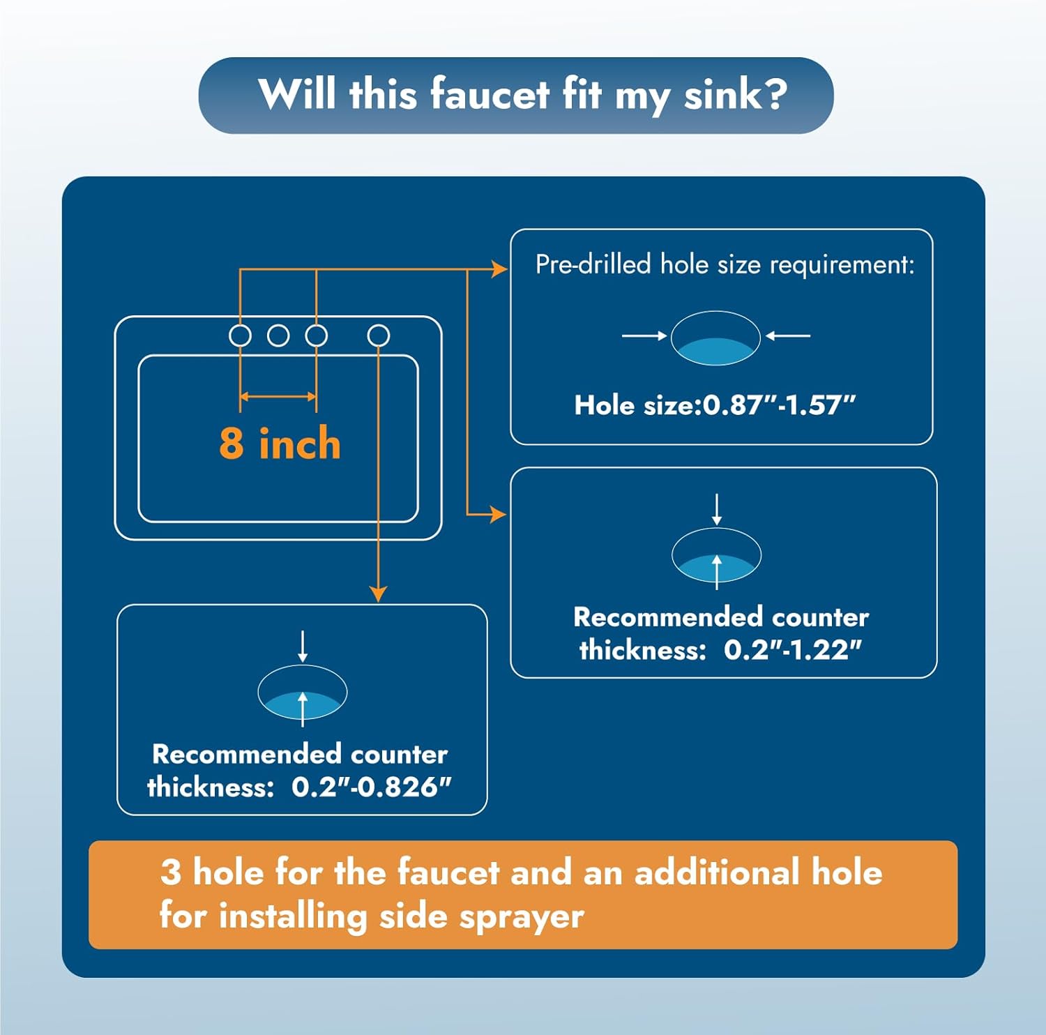 - 8 Inch Kitchen Faucets: This kitchen faucet is designed for 3 or 4 hole sink with hole distance 8 inch. 3 holes for deck mount faucet and an additional hole for side sprayer installation