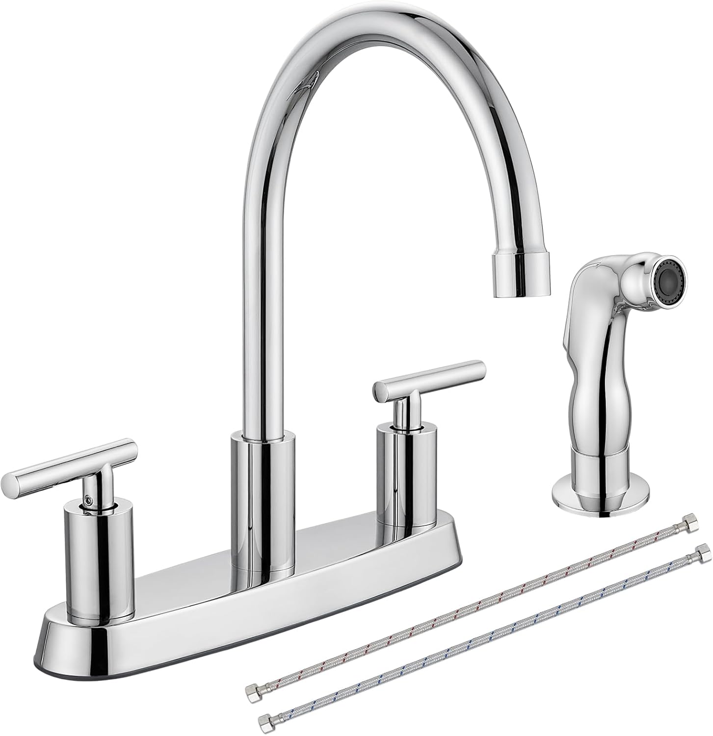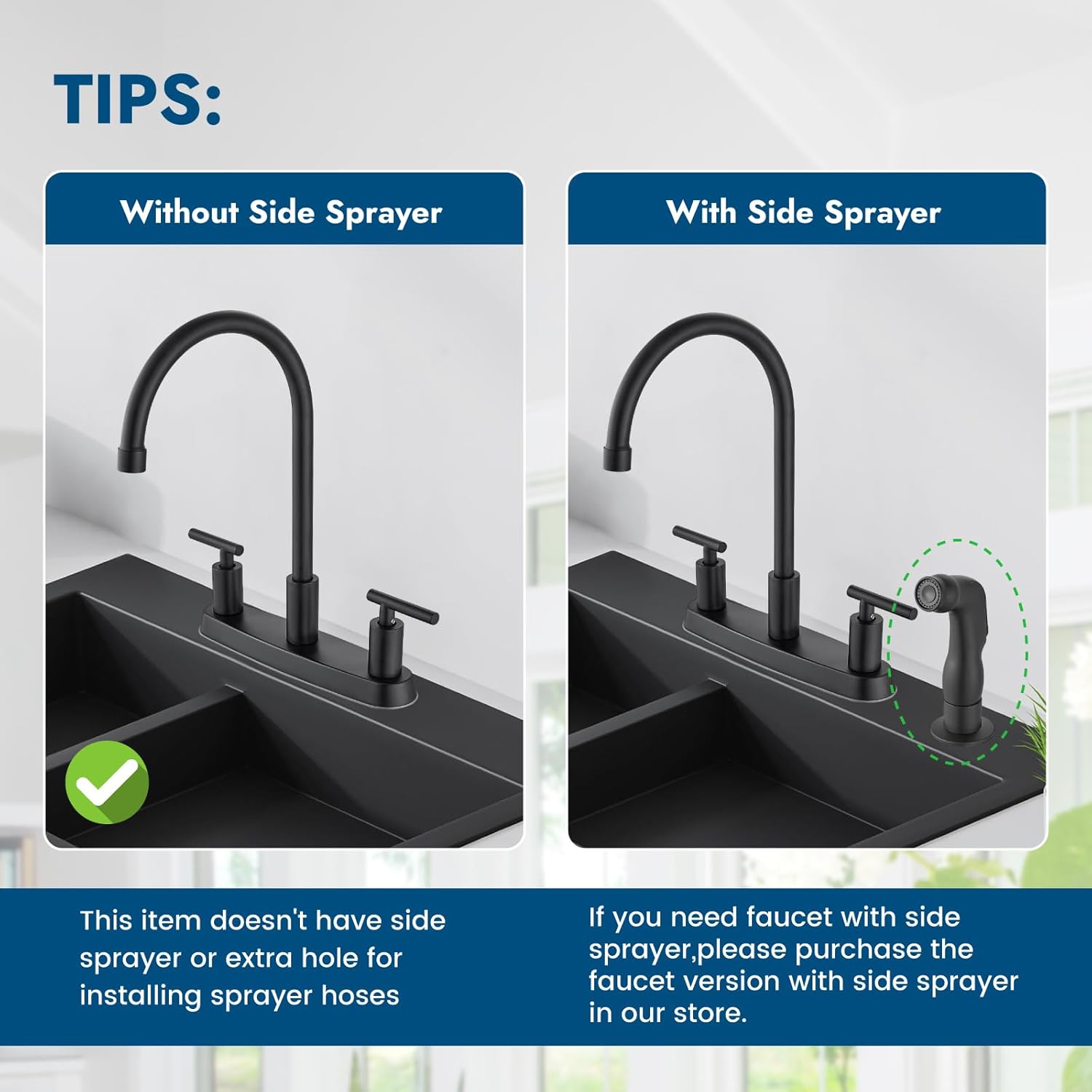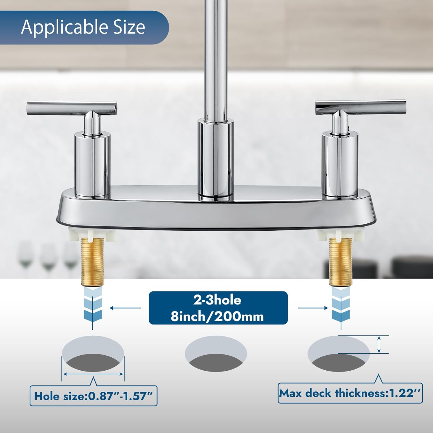 - 8 Inch Kitchen Faucets: This kitchen faucet is designed for 3 or 4 hole sink with hole distance 8 inch. 3 holes for deck mount faucet and an additional hole for side sprayer installation