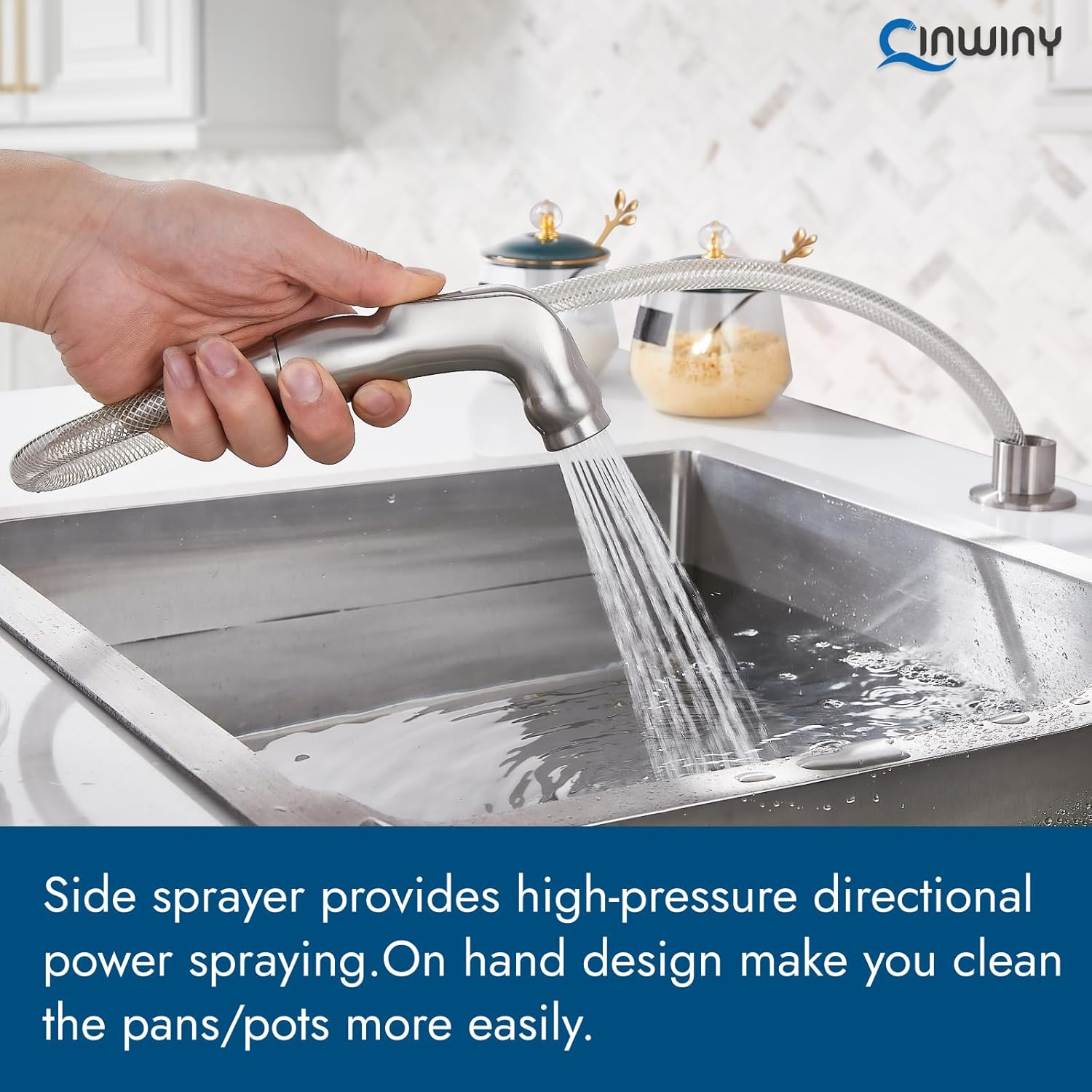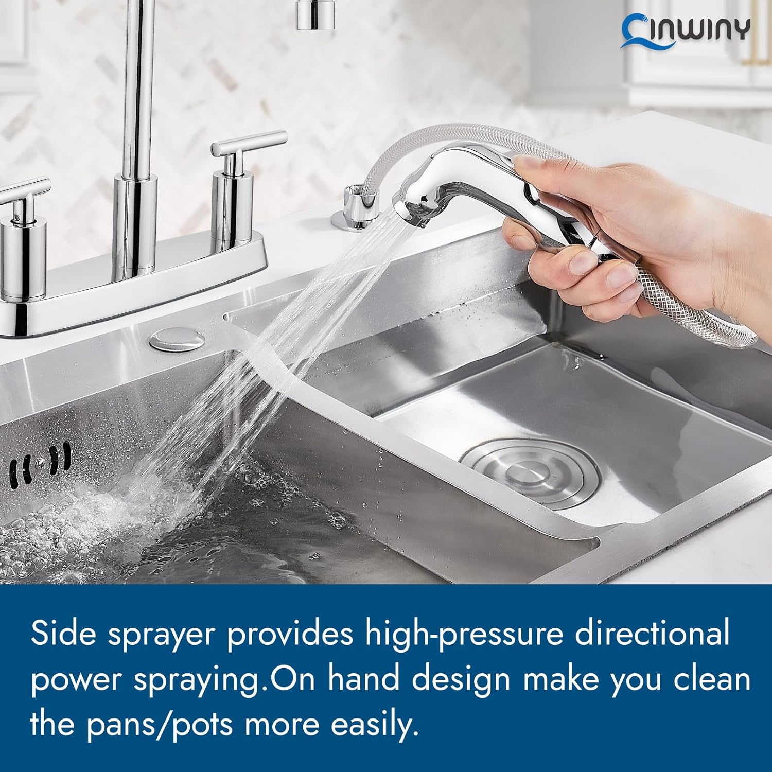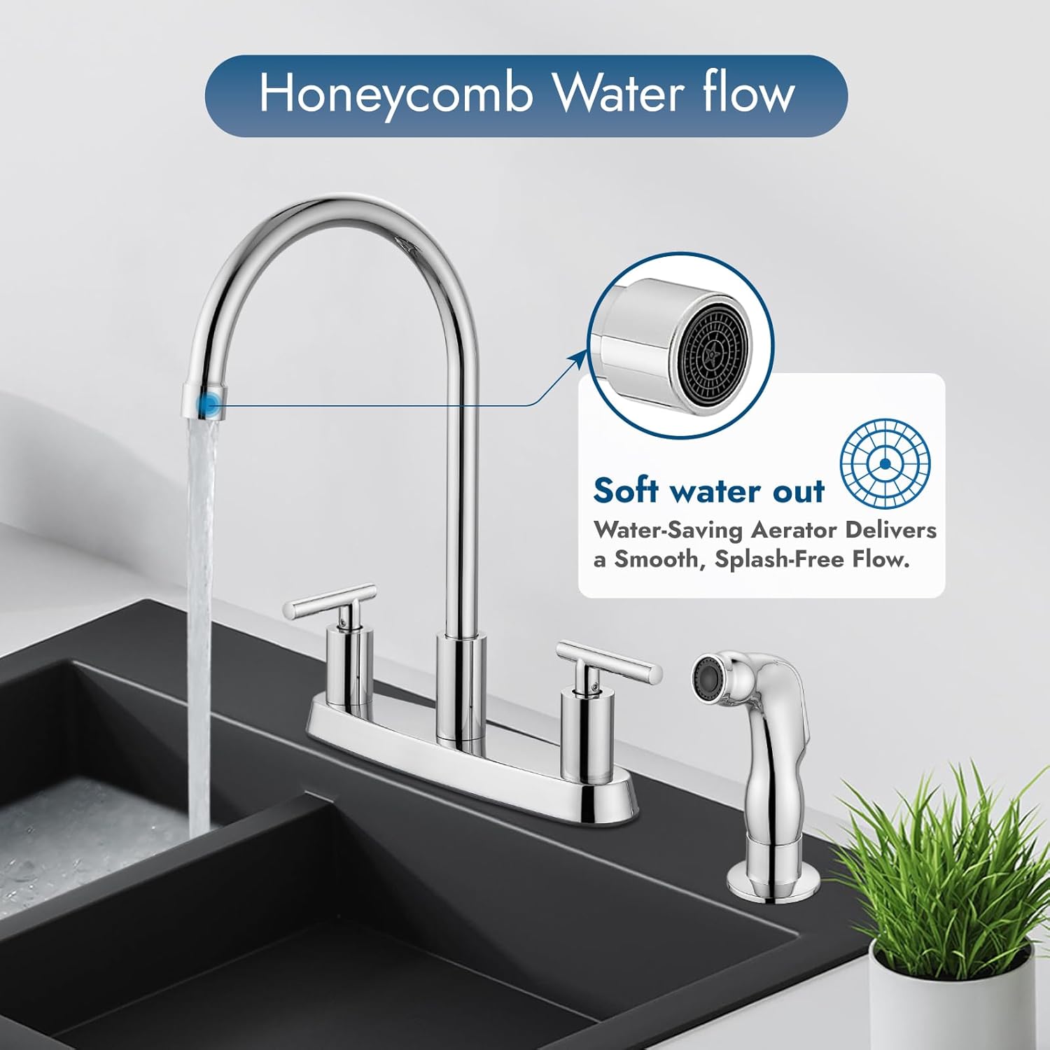 - SUS304 Spout Pipe: Maximum Flow Rate:1.8 gpm. The spout of this Cinwiny two handle kitchen faucet with side sprayer is made of stainless steel, which has excellent resistance to rust and fingerprints