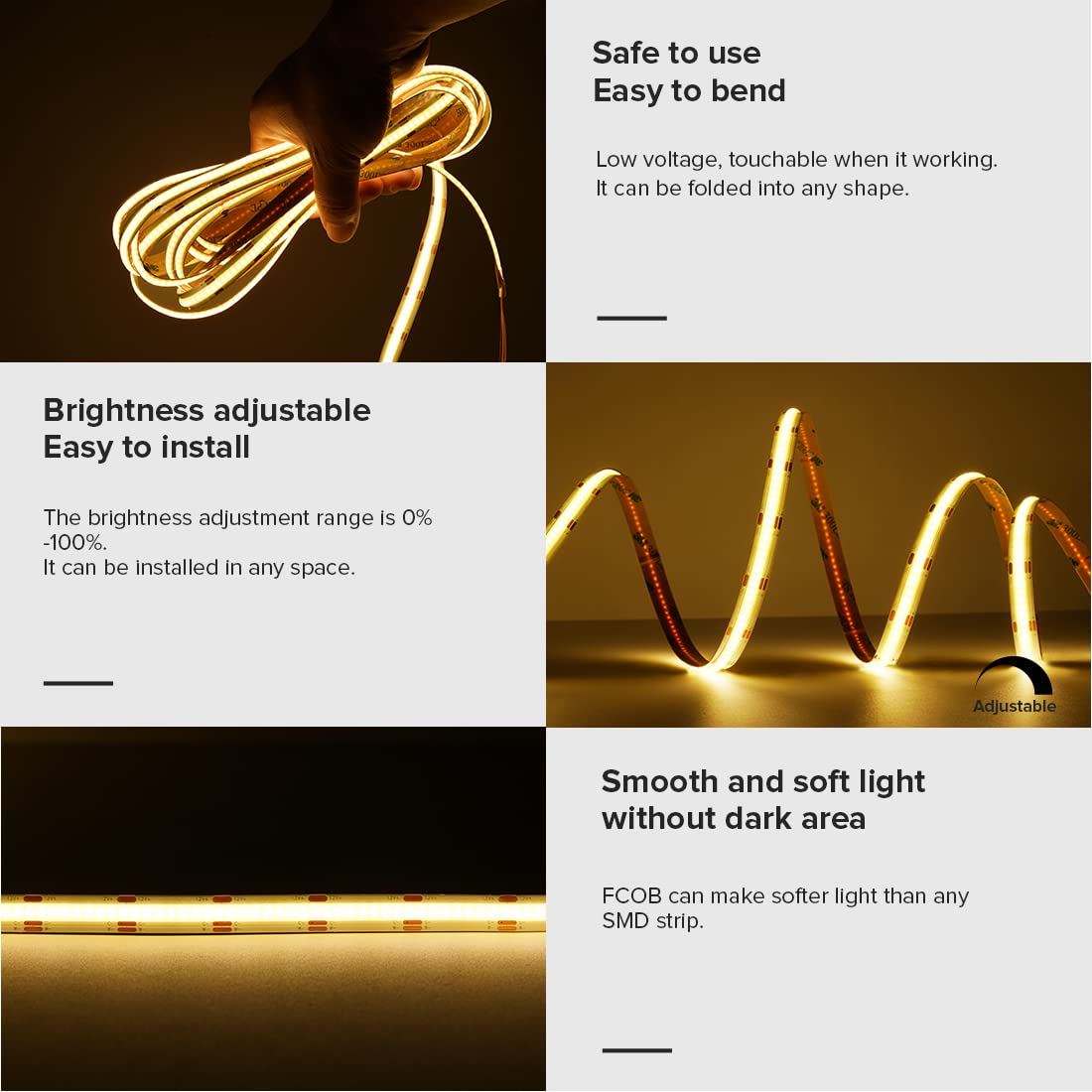 - 【Energy efficient】FCOB LED strip lights of single color series is more energy efficient. It is dimmable and durable with more than 50000 hours lifespan. We also provide 12 months worry-free warranty and 24/7 customer service.