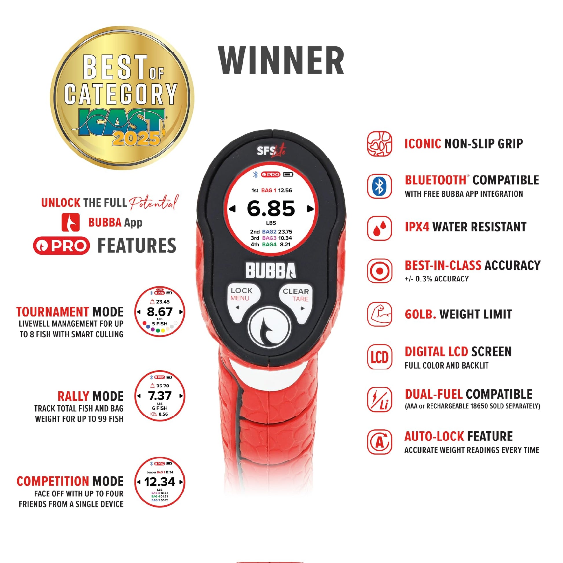 Details: Introducing the Smart Fish Scale LITE, the latest in fish scale innovation from Bubba. Slimmed down with all the great best-in-class features you've come to trust from Bubba, the Smart Fish Scale LITE will give you the needed information quickly and accurately. Pair the SFS Lite with the BUBBA App to effortlessly store your catches' weights, species, weather, and GPS locations. Additionally, you can host or join private and public tournaments within the app, tracking other anglers’ catches around the country in real-time.