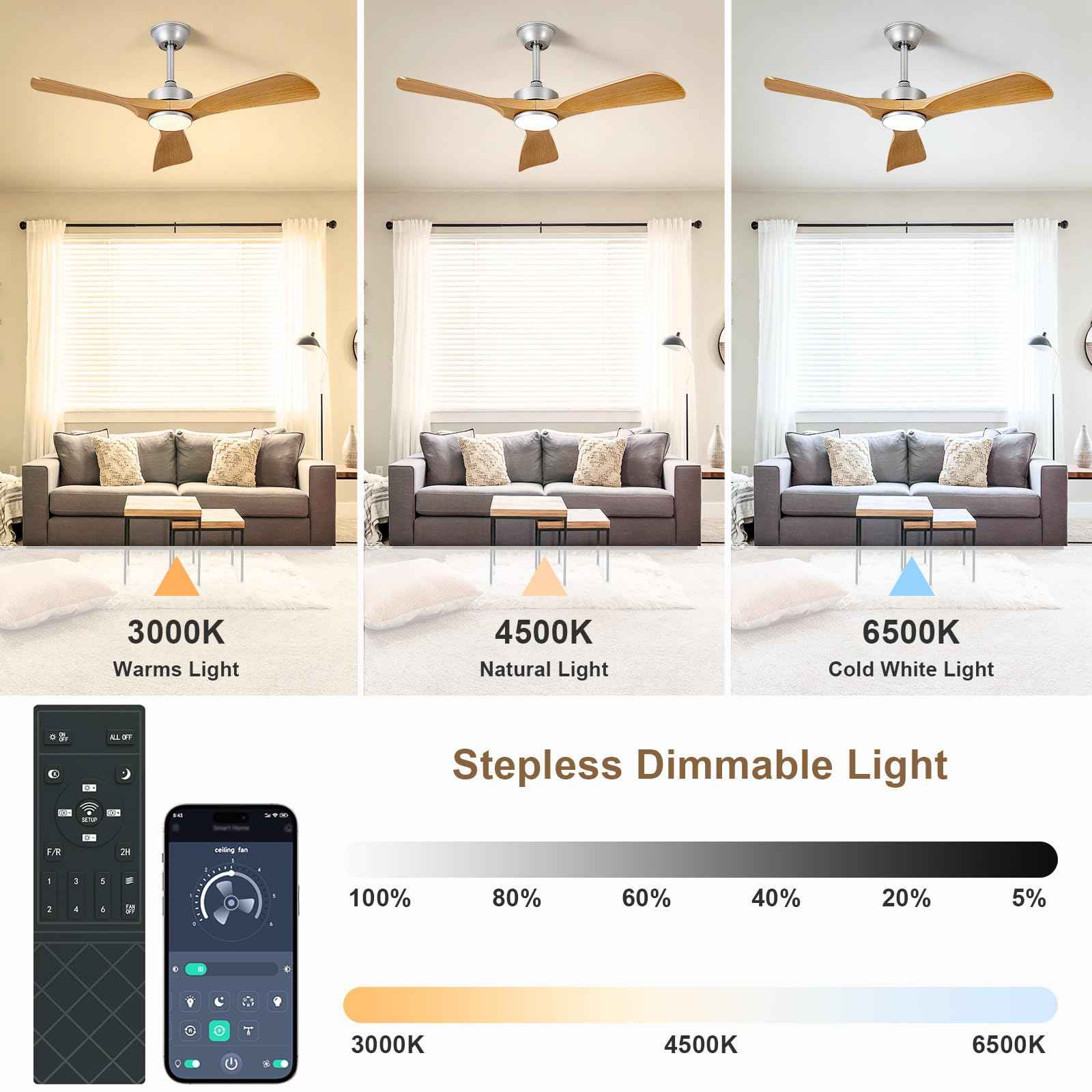 - Smart Fan with APP Control & Remote: You can turn ceiling fan/ light on/off independently with the wood color fan's remotel (with beep) or smart App. Enjoy the convenience of a ceiling fan with light, allowing you to control the 6 fan speed, forward and reverse rotation, 3000K-6500K LED lighting, and 2h timer from the comfort of your space, making it an ideal choice for a modern ceiling fan with light