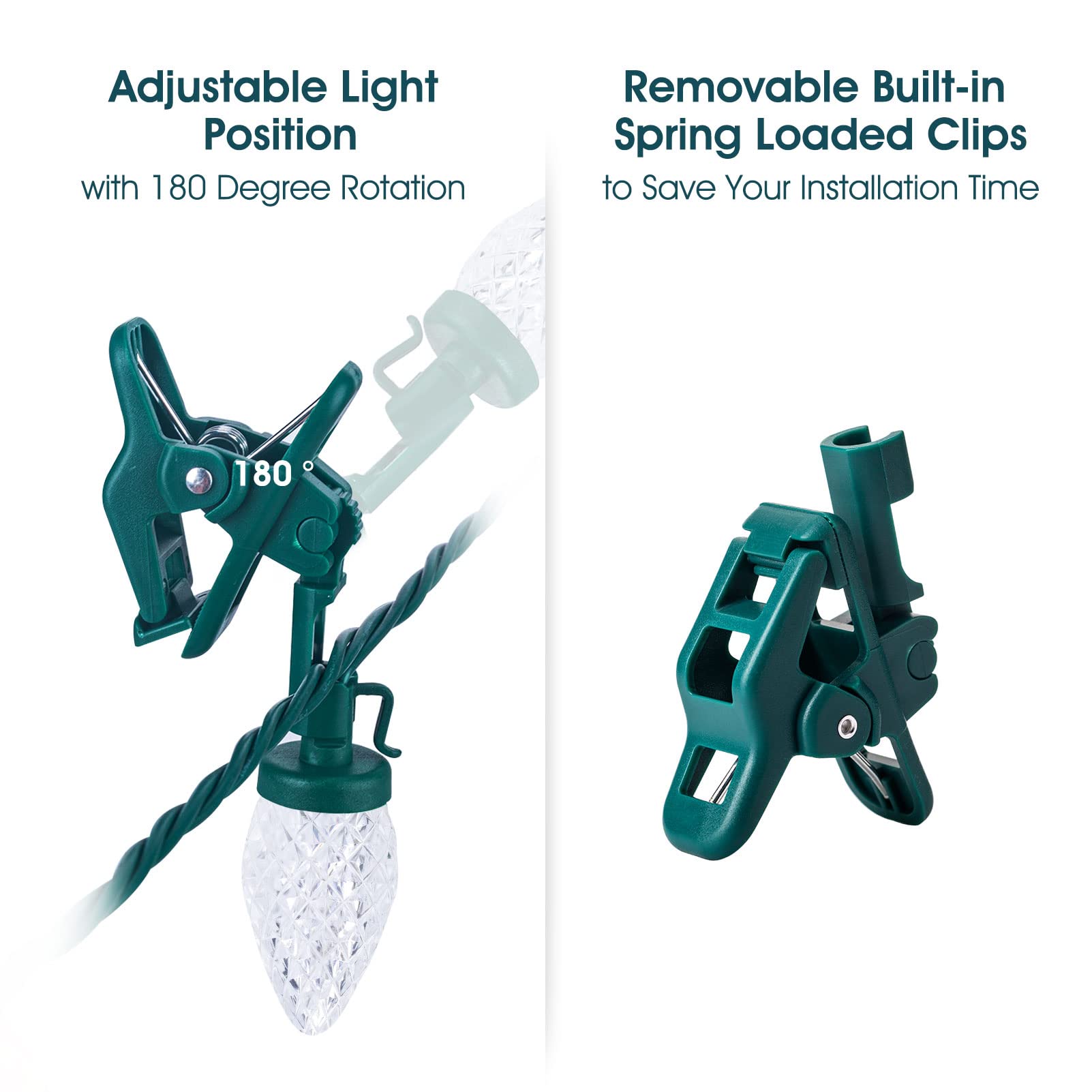 - Convenient Firm Setup and Removeable Quick Clips: These energy efficient C9 LED Christmas lights feature spring-loaded clips that provide a convenient and firm setup. Compared with ordinary clips, the spring-loaded clips can more firmly and securely fastening the lights to various surfaces such as roofs, railings, or trees. The clips can also be easily removed if needed. Perfect for indoor and outdoor use