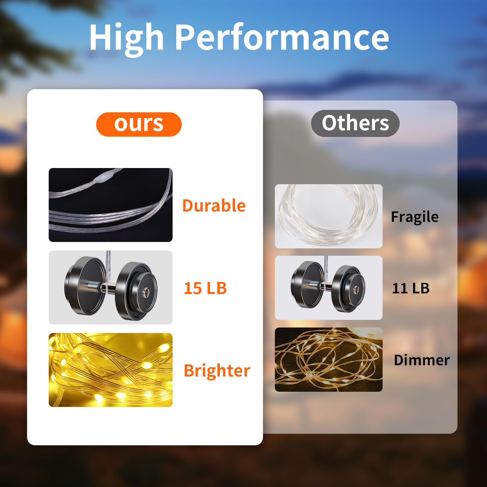 - Waterproof and Durable: With an IP44 waterproof rating, the camping string lights are suitable for various outdoor activities, even in wet environments. The LED light strips are made of copper wire and transparent PVC material, providing clear 360-degree lighting. Highly flexible and tangle-resistant, they can be easily bent. 10 meters long battery string lights is the best choice for decorating your tent