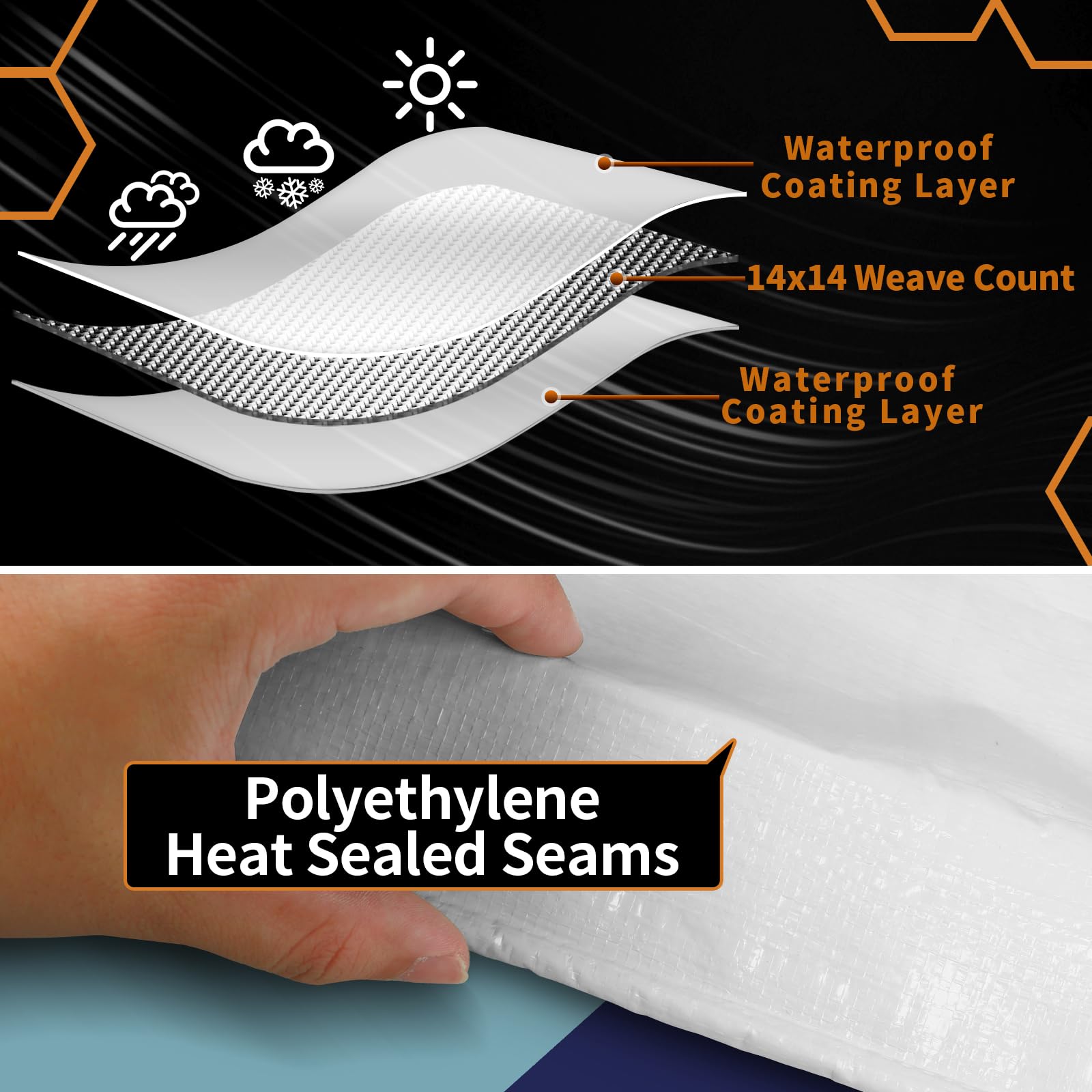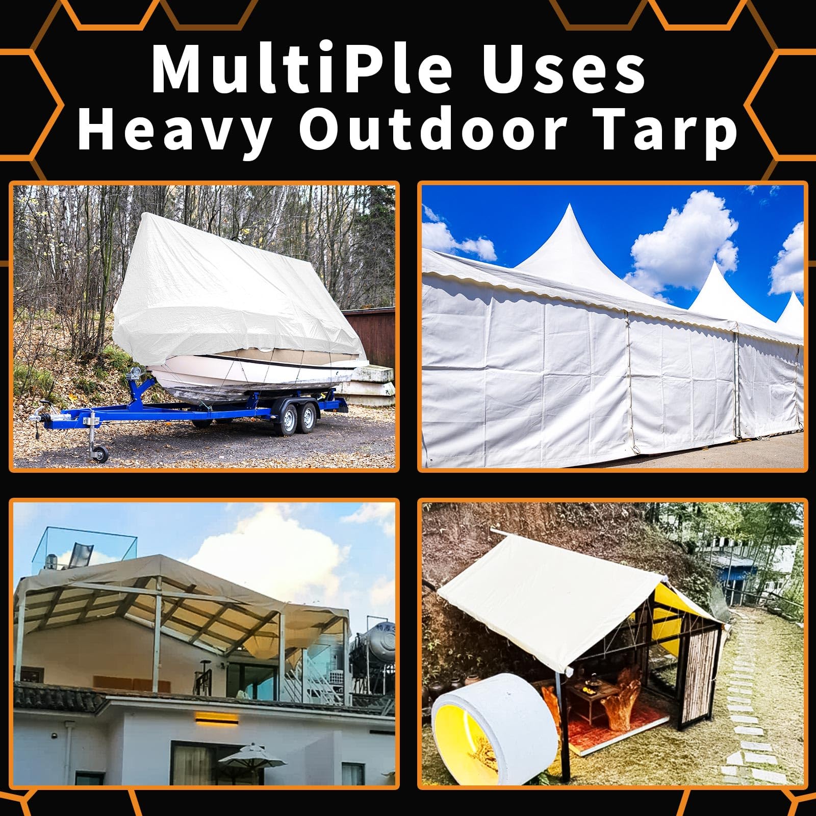- 【 10 MIL HEAVY DUTY TARP】 White heavy duty tarp it has a 10 mil thickness, 5oz per square yard, 14×14 weave count, with Anti-rust grommets Every 20 inch, use heat sealed seams.