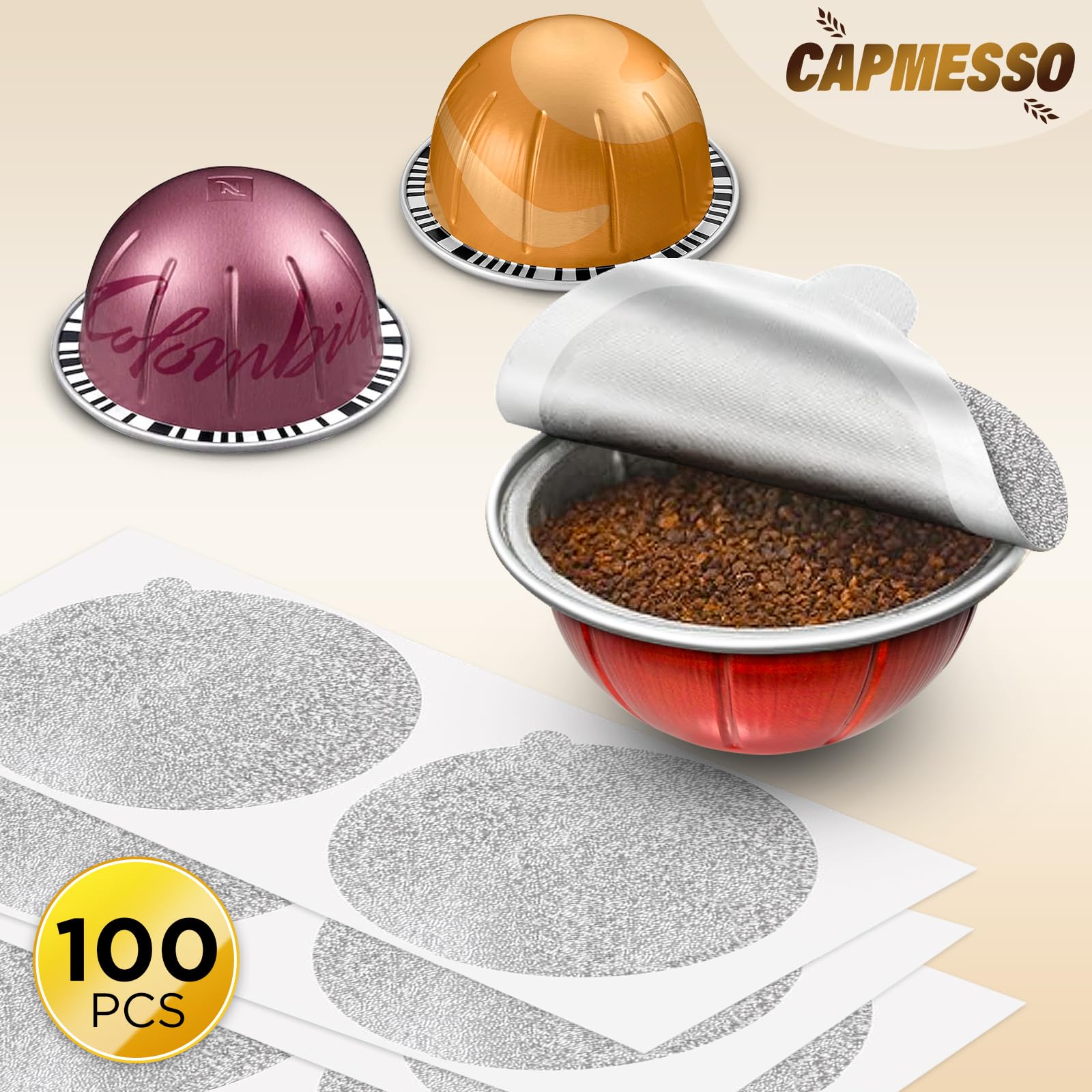 CAPMESSO Aluminum Foil Lids for Nespresso Vertuo Pods: 100 PCS Foil Seal Cover for Reusable Nespresso Pods Vertuo - V2 Perfect Size for nespresso refillable pods(Foil Lids Only)