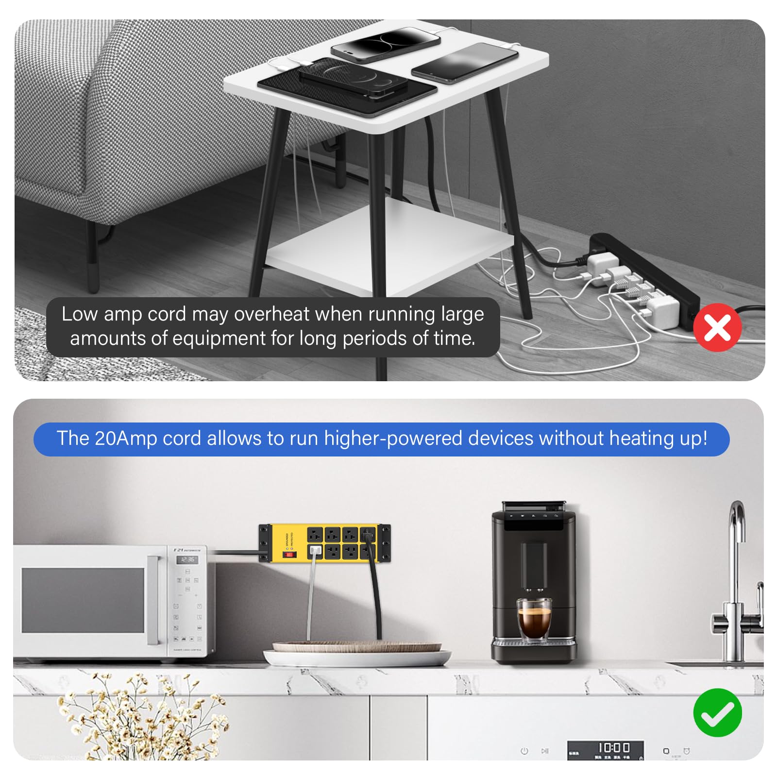 CCCEI Yellow Heavy Duty Power Strip Surge Protector 20 AMP, 8 Outlets 12 Gauge Industrial Shop Garage Metal Multiple Outlets, 25 FT Extension Cord 5-15P Adapter High Amp 6-20R T-Slot 20a for Appliance