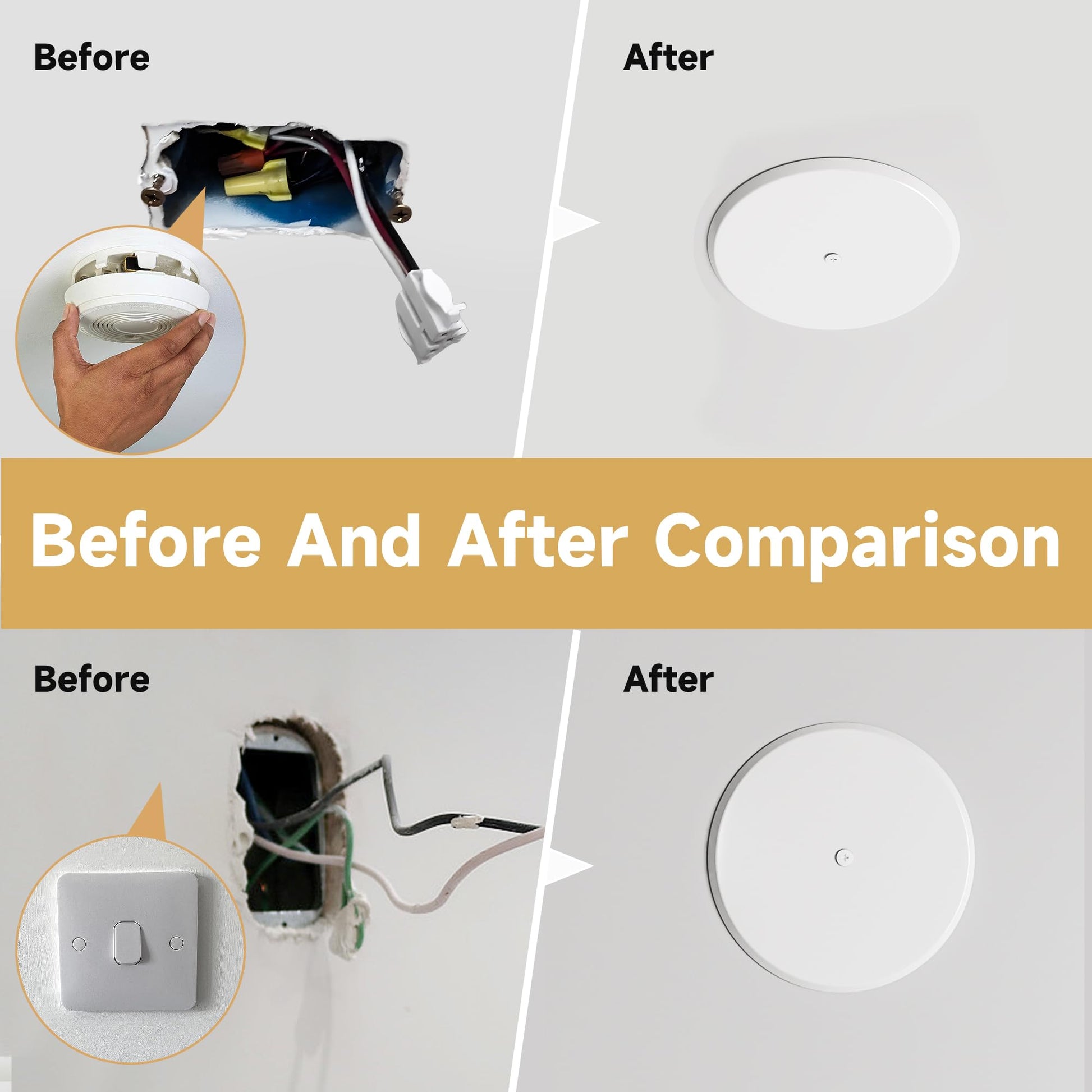 - 【Widely applicable】: Our outlet cover plates feature a stylish 5-inch profile that works with any screw space between 1.75 inches to 3.5 inches for seamless installation on a variety of standard electrical boxes,designed to cover and hide unused electrical boxes or wiring holes. Ideal for covering wall holes after removing fire alarms, smoke alarms, recessed lighting, ceiling fans, ceiling lights, round electrical outlets and more. Great for covering exposed holes in walls or drywall