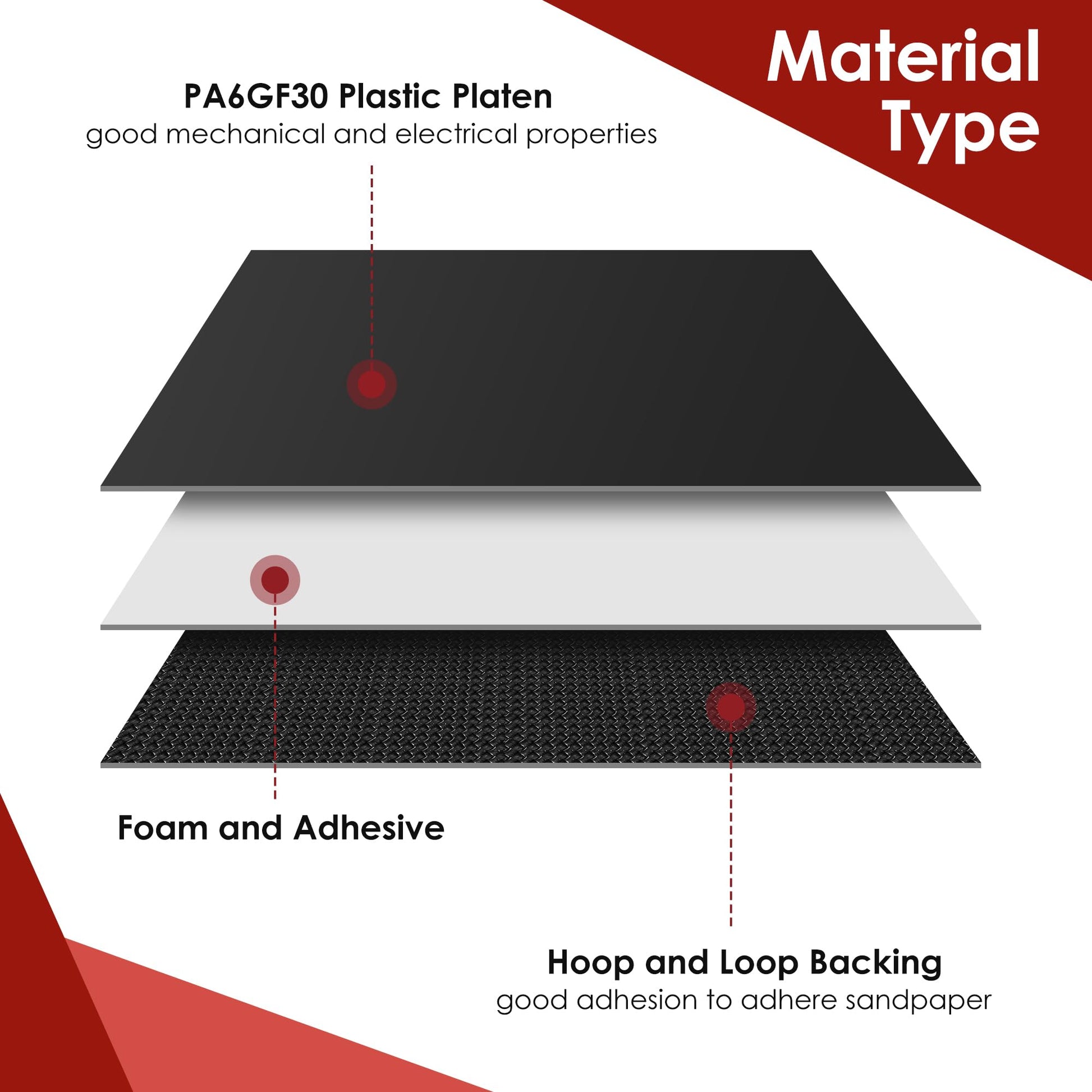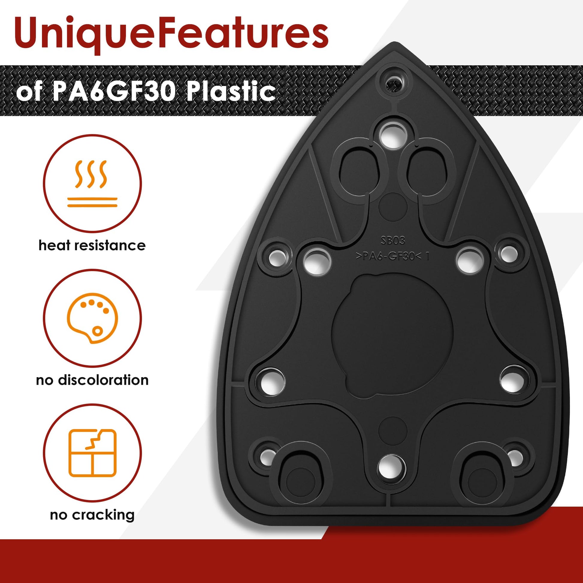 - Material: The detail sander pad is made from PA6GF30 plastic (plastic platen adhesive with hoop and loop backing), which featured with high toughness, high heat resistance, no discoloration, no cracking, as well as good mechanical and electrical properties