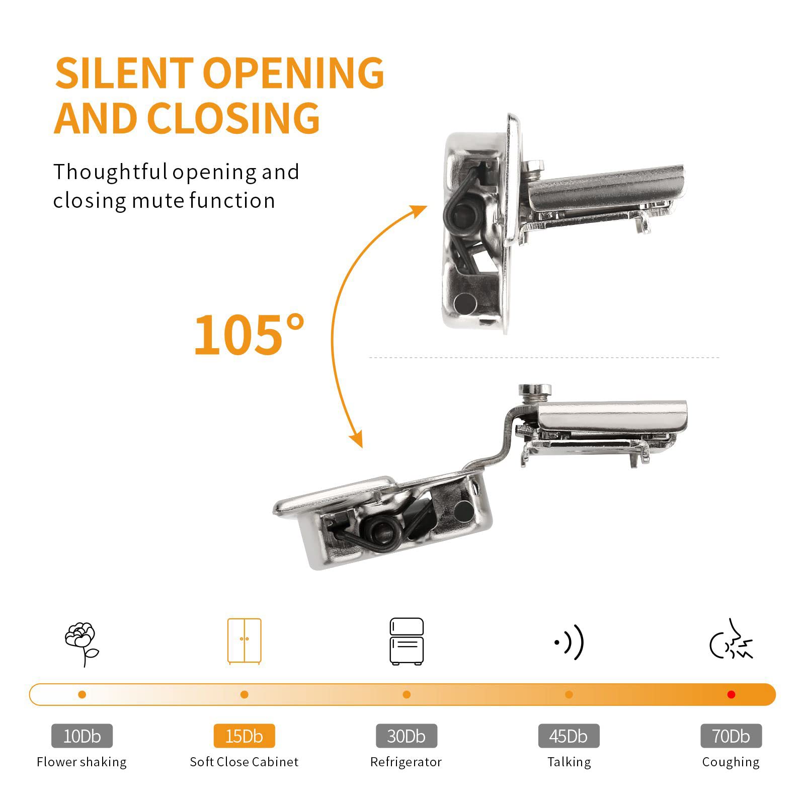 - SOFT CLOSE CABINET HINGE: Each overlay concealed cabinet hinge includes a built-in POM damper, Reduced closing speed prevents noises from the kitchen and prolongs the life of doors, cabinets, and hinges. In addition, it also supports ★SMALL SOFT CLOSE ANGLE★, which can better protect your finger.