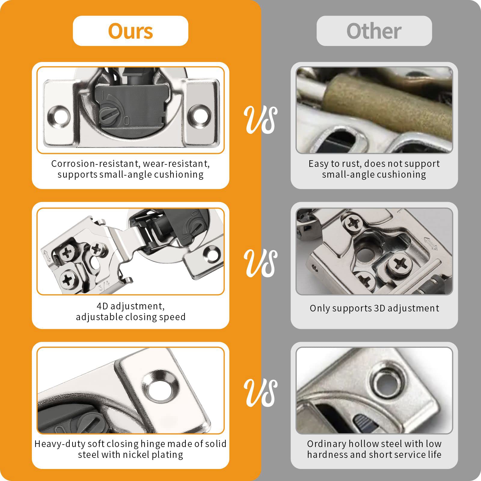 - 4D Adjustable Upgrade: 4D hinges can adjust the cabinet door just by turning a screwdriver (Vertical, Horizontal, Depth, Closing Speed), which will make sure that your new custom-made cabinet doors don't sag, align properly, and will open and close smoothly; Closing speed can be adjusted at will within 0-7s.