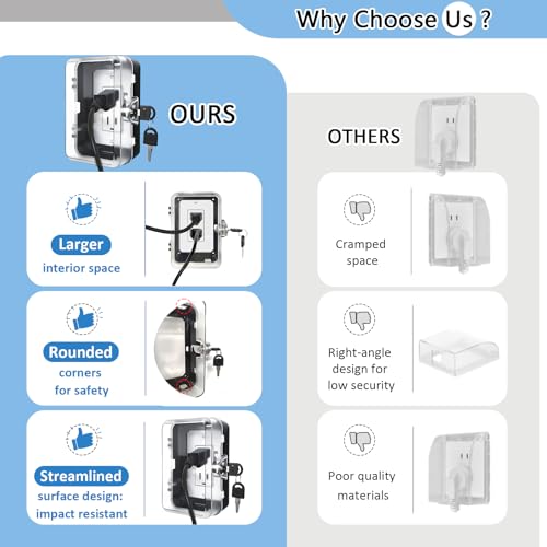 - ¡¼ABS Shatter proof Material & Dual Insurance for Kids & Pets¡½Made from premium shatter-proof ABS plastic, this outlet lock box is designed to withstand curious toddlers and chewing pets. Its smooth, bite-resistant surface prevents damage from claws or teeth, keeping both kids and pets safe from electrical accidents.