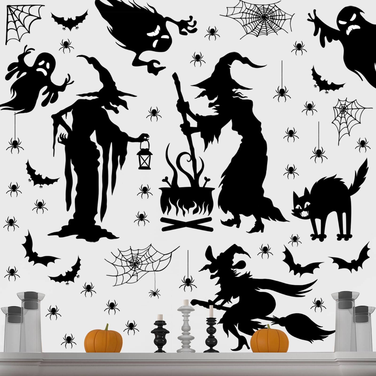 Cholemy Halloween Wall Decals - 4 Sheets, 35.4 x 11.8 Inch Large Witch Spider Bat Pumpkin Stickers, Removable Clings for Home Party Decor Supplies
