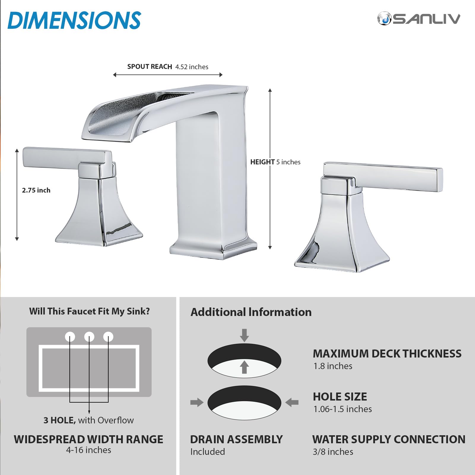 Chrome Bathroom Sink Faucet,Sanliv 3-Piece Widespread Bathroom Faucets for 3-Hole Sinks 4-8 inch,2-Handle Waterfall Vanity Faucet with Drain Assembly,Polished Chrome
