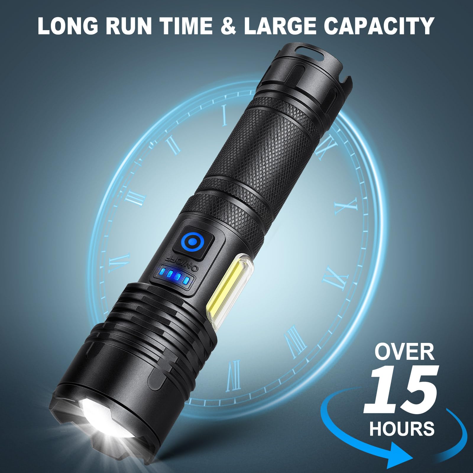 - 【15 Hours Duration & USB Rechargeable】LED flashlight features an extra-large capacity battery that provides up to 15 hours (Low mode) of powerful, non-diminishing brightness. You can charge it in 3-4 hours using the included USB cable. The flashlight button has four indicator lights, each representing 25% of the power level, so you can see the power status at a glance