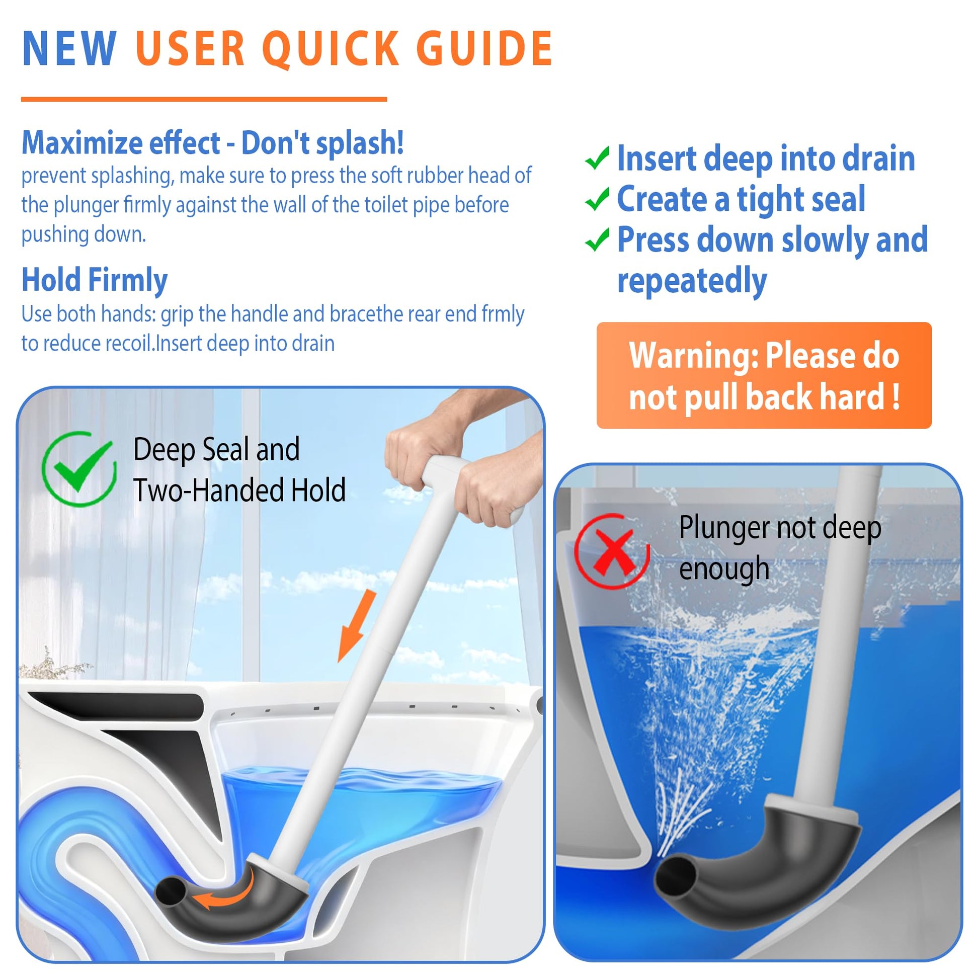 - 360 DEGREE DEEP CLEANING: The sink plunger adopts a straight tube structure design, where you only need to grip the handle with both hands and apply downward force. The head of the plunger can penetrate the pipeline without getting stuck.