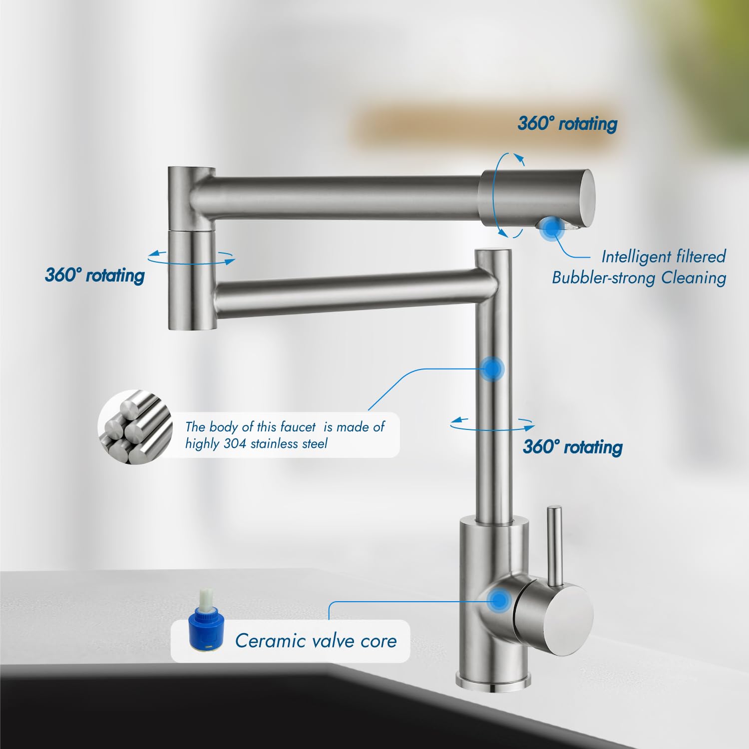 - 【Hot and Cold Water】Cinwiny kitchen sink stainless steel countertop deck mount pot filler use one single handle to control cold and hot water, one hole counter mounted, dual swing joints that can rotate 360 degrees, dual valve control has greater flexibility when used Simple single handle pot filler with ceramic valve provide smooth turning action and prevent dripping.