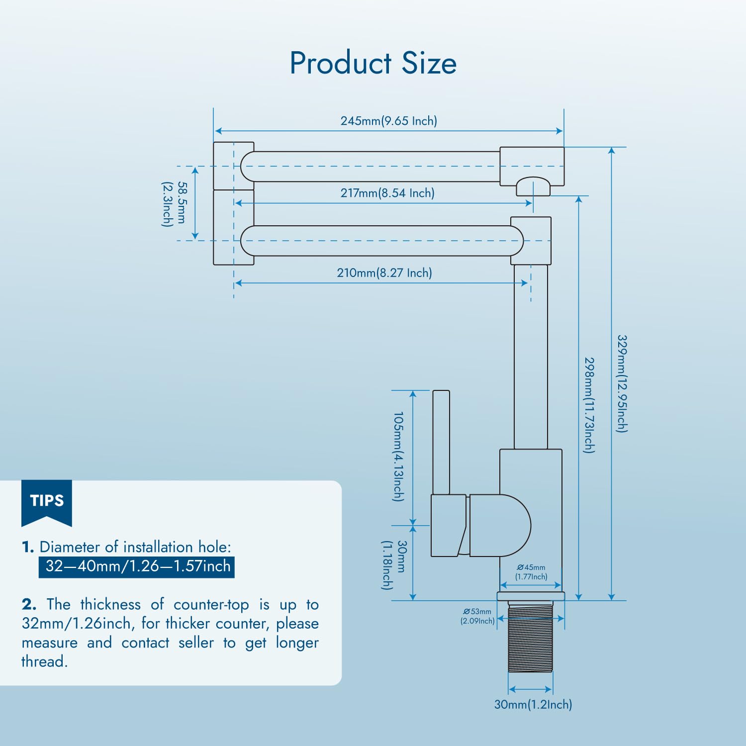 - 【Installation size】The diameter of installation of hole should be 32mm (1.26inch) -40mm(1.57inch). The max countertop thickness is 32mm (1.26inch). Please pay attention to whether the size is suitable for the hole size in your home before buying