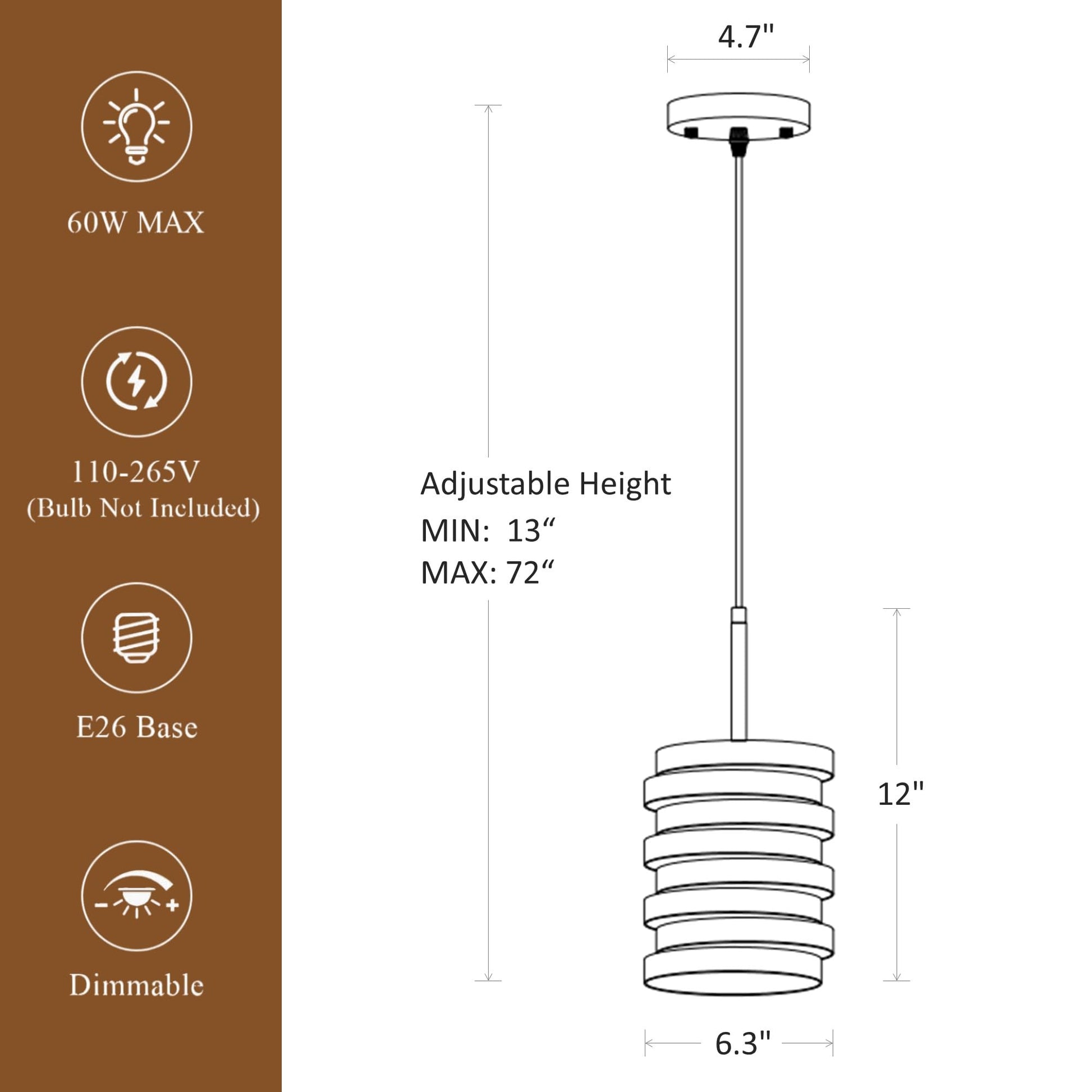 - Size & Widely Applications -- Diameter: 6.3in, Height: 13~72in. Canopy Diameter: 4.7 in. Comes with 59-inch long wires, so you can flexibly adjust the hanging height of the small round pendant light. Sloped ceiling adaptable.
