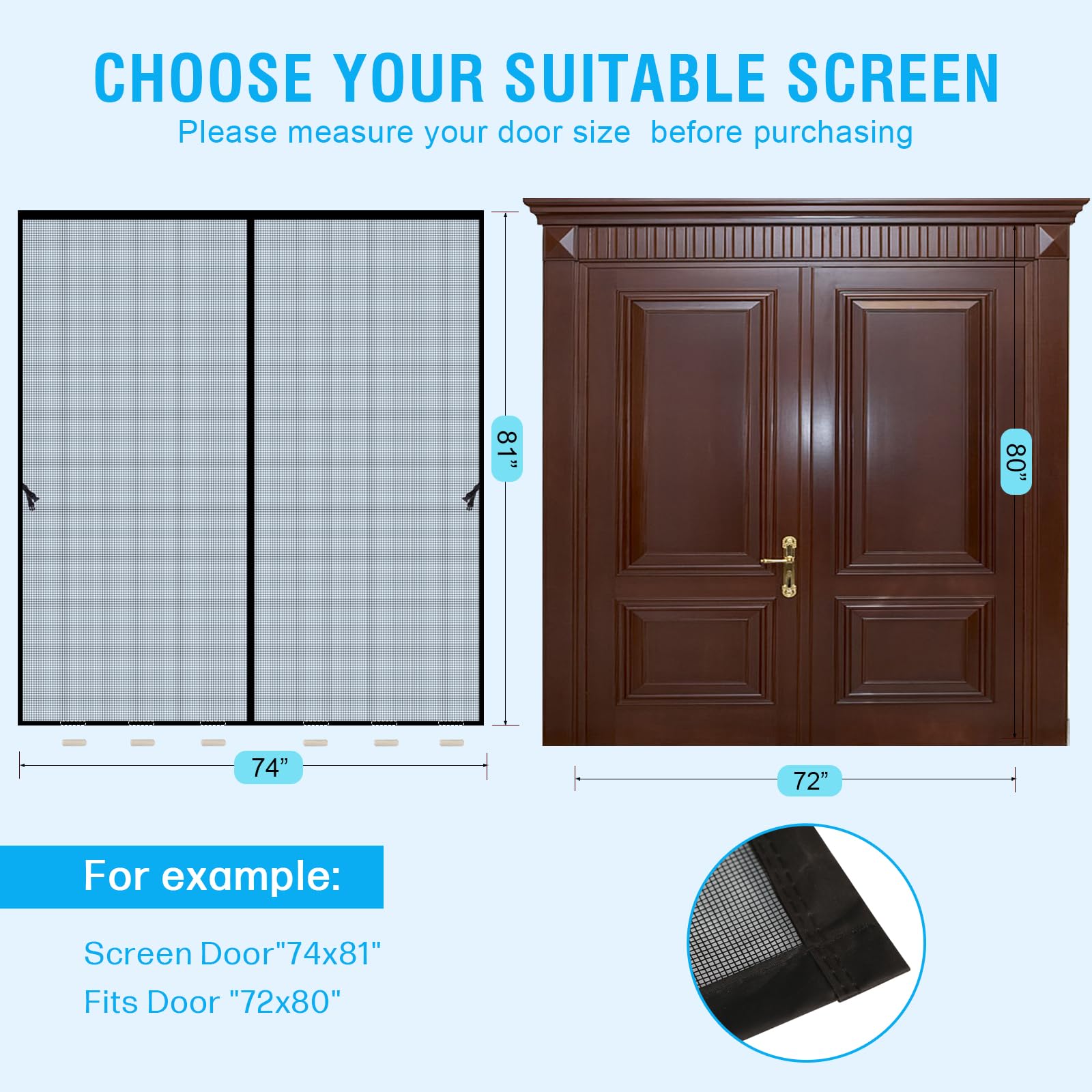 - Choose the Right Size: Fits doors measuring 72" x 80" (screen size: 74" x 81"). Please measure your door (excluding the frame) carefully before purchasing to ensure a perfect fit.