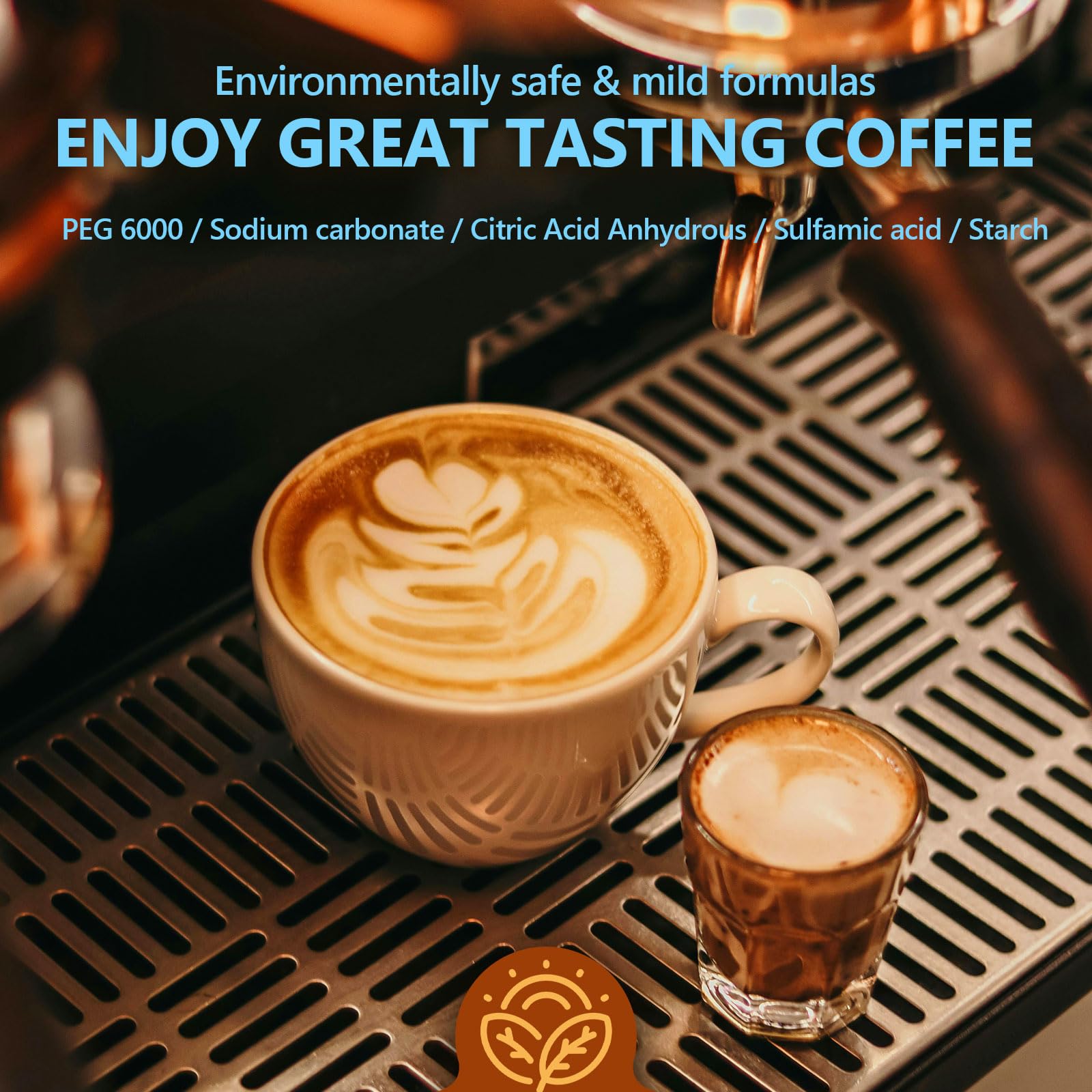 - Ingredients Safe: Our Coffee maker cleaner tablet Ingredients PEG 6000, Sodium carbonate, Citric Acid Anhydrous, Sulfamic acid, Starch. A gentle formula to clean and descale your machine.