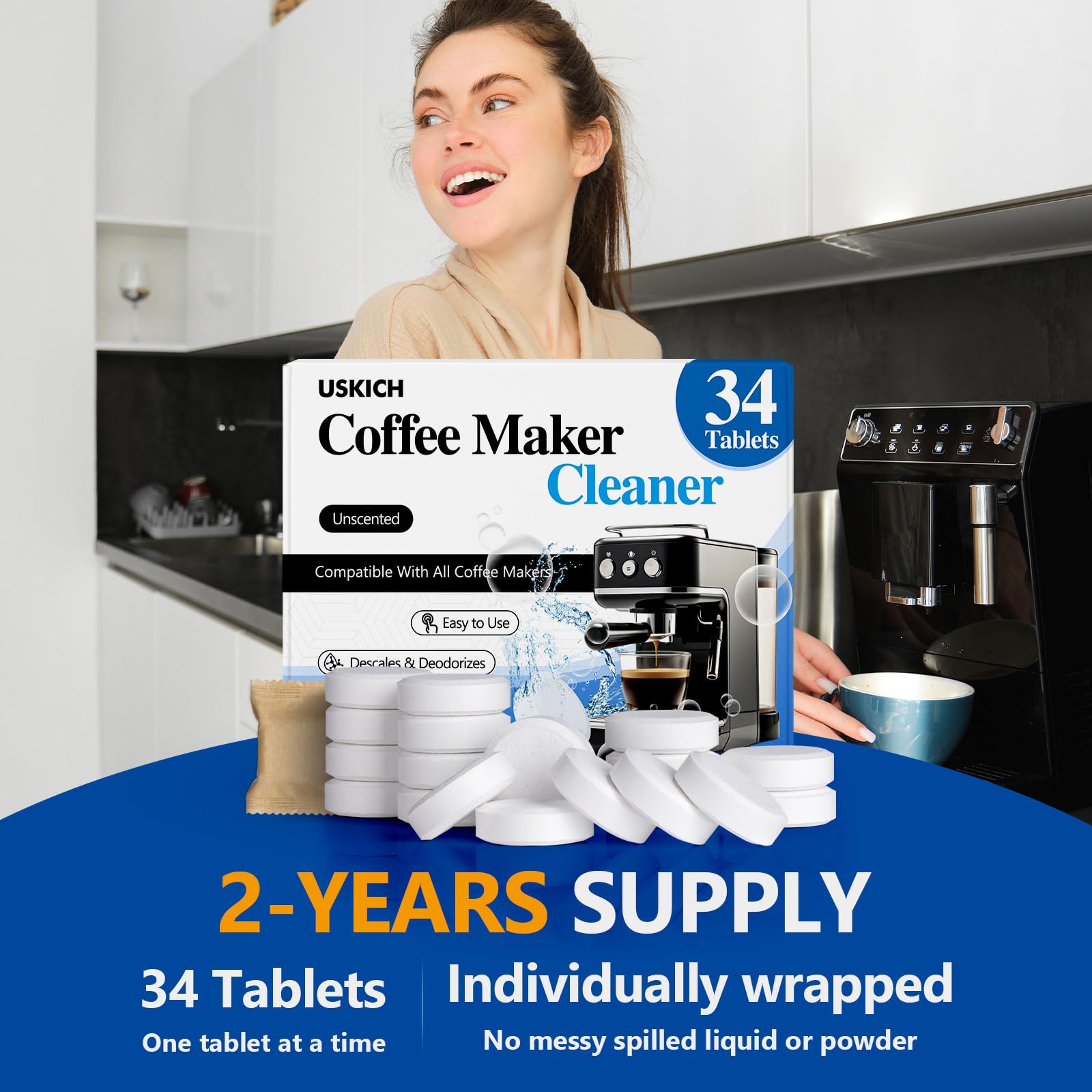 - Bulk Coffee Maker Cleaner Tablet: 34 Tablets work out to two year supply or more.Compared to other products like powder, sachet and packets, there is no messy spilled liquid or powder. Choose USKICH coffee machine descaler to keeping your machine clean longer!
