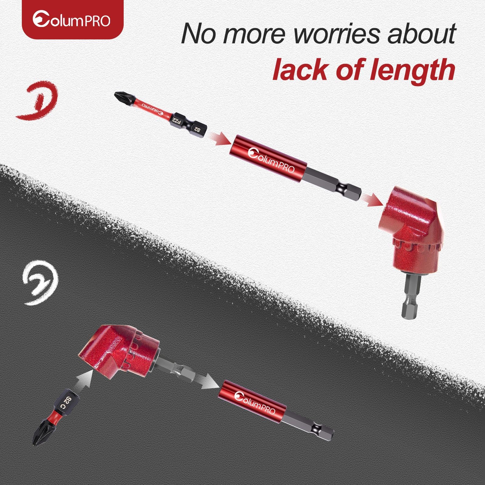 - ☛【Package Includes】: The ColumPRO storage set contains five products: a 105-degree right angle drill adapter, a 50mm PZ2 screwdriver bit, a 50mm PH2 screwdriver bit, a 25mm PZ2 screwdriver bit, a 25mm PH2 screwdriver bit and a sturdy magnetic extension bit holder. The extension bit holder can bring you good experience when doing some work where the distance is not enough.