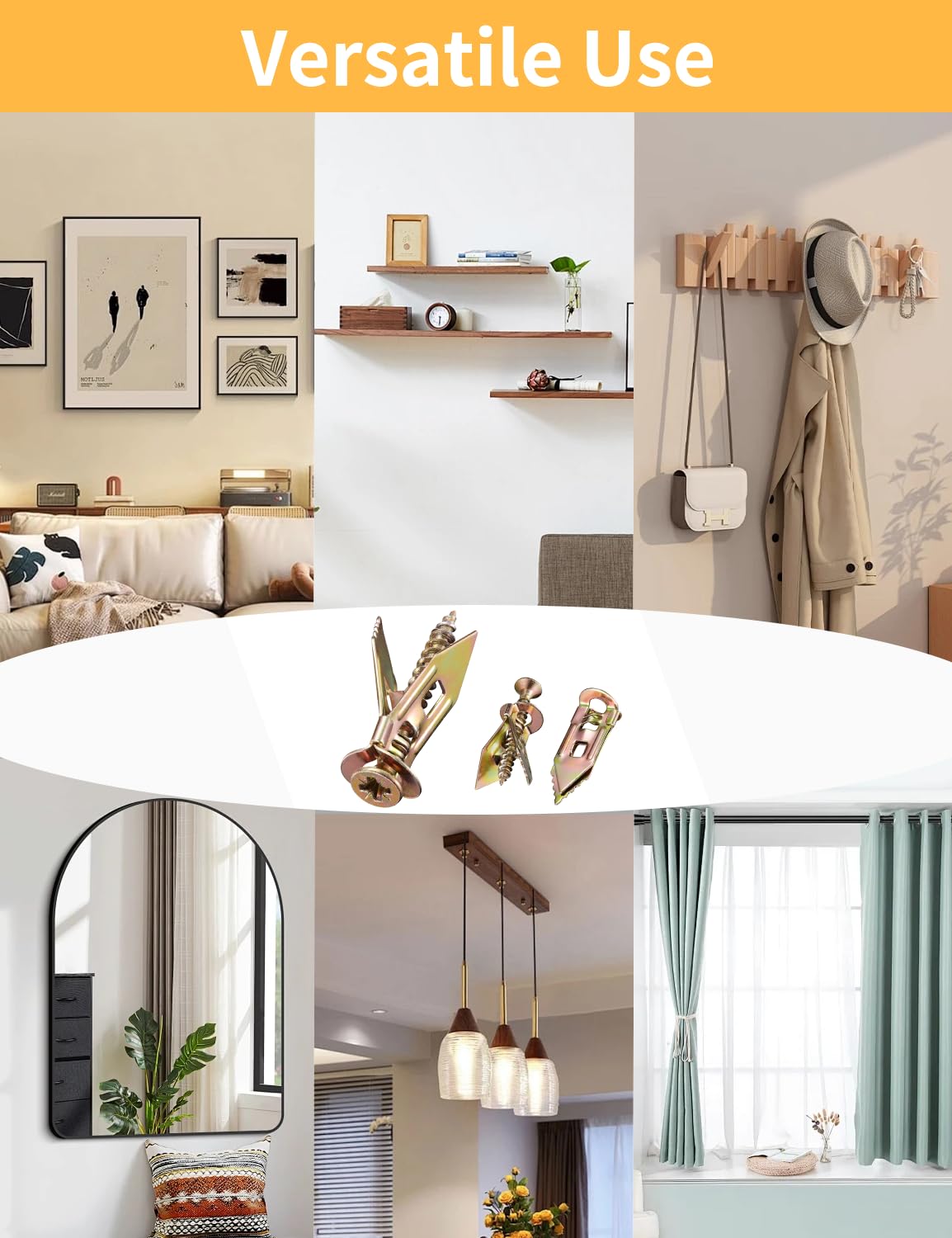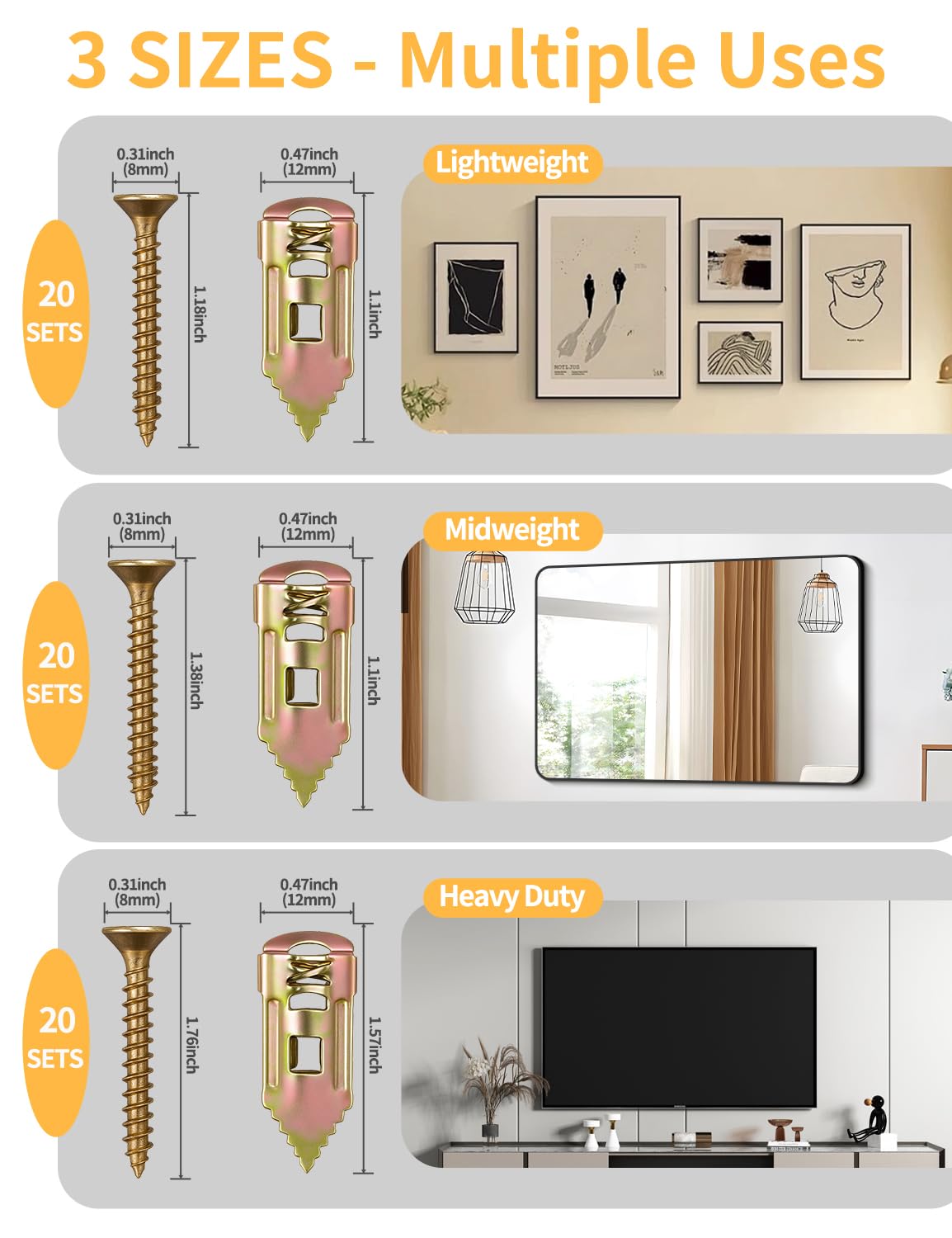 - 3 SIZES FOR EVERYTHING – PHOTO FRAMES TO TVs: 1.18"(1-3/16") for photos & small decor, 1.38"(1-3/8") for shelves & mirrors, 1.76"(1-9/16") for TVs & heavy items.No guesswork-just match the drywall anchors to your wall thickness and what you're hanging. Supports up to 100 lbs+ without fail
