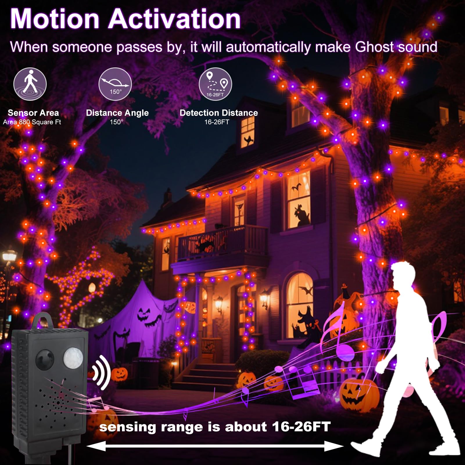 Connectable 400 LED Halloween String Lights, Motion Sensor Scary Sound 66Ft Orange and Purple Halloween Lights Outdoor Waterproof 4 Sound Effects for Yard Party Tree Decor