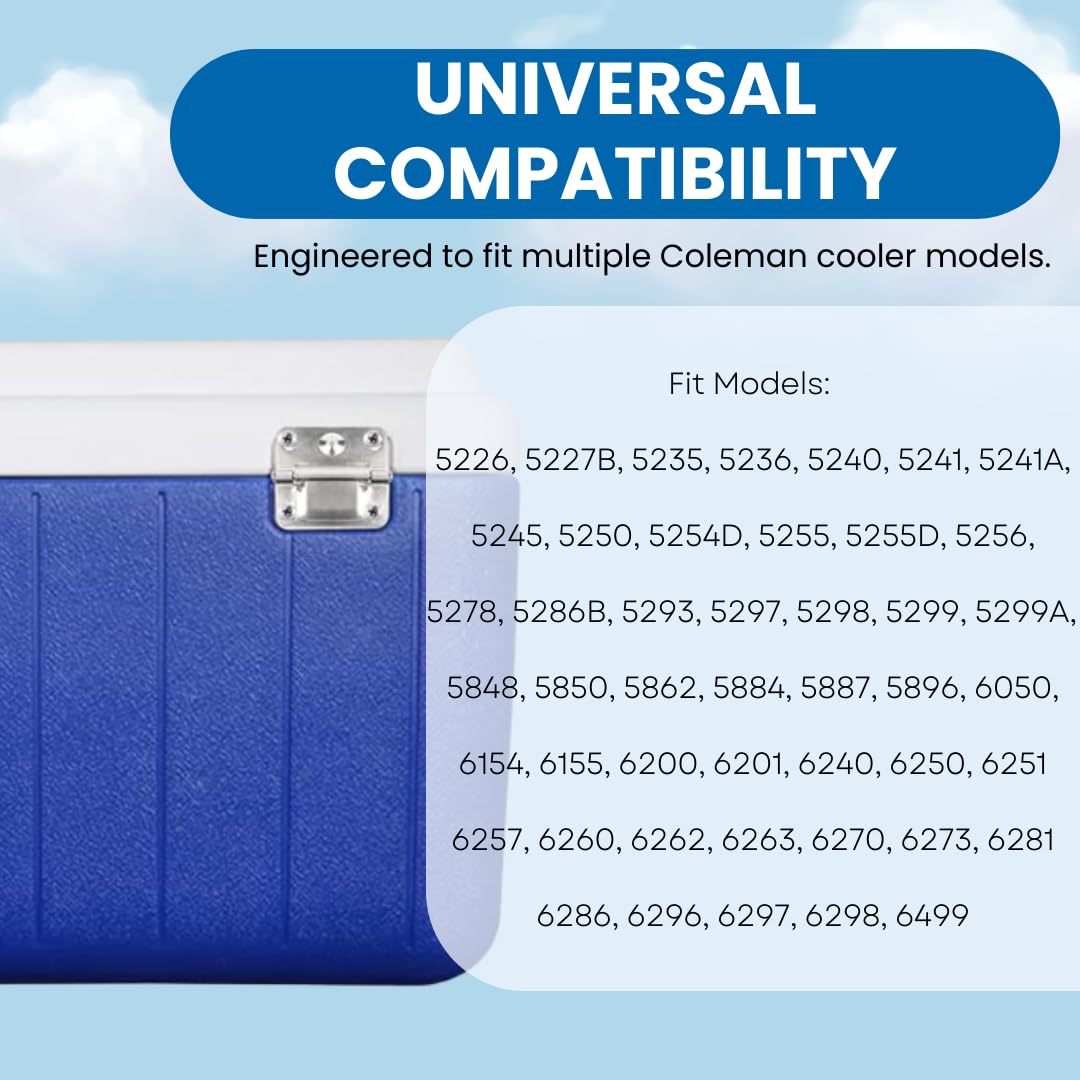 - Compatible with a variety of Coleman cooler models:5226, 5227B,5235,5236, 5240, 5241, 5241A, 5245, 5250, 5254D, 5255, 5255D, 5256, 5278, 5286B, 5293, 5297, 5298, 5299, 5299A, 5848, 5850, 5862, 5884, 5887, 5896, 6050, 6154, 6155, 6200, 6201, 6240, 6250, 6251, 6257, 6260, 6262, 6263, 6270, 6273, 6281, 6286, 6296, 6297, 6298, 6499.