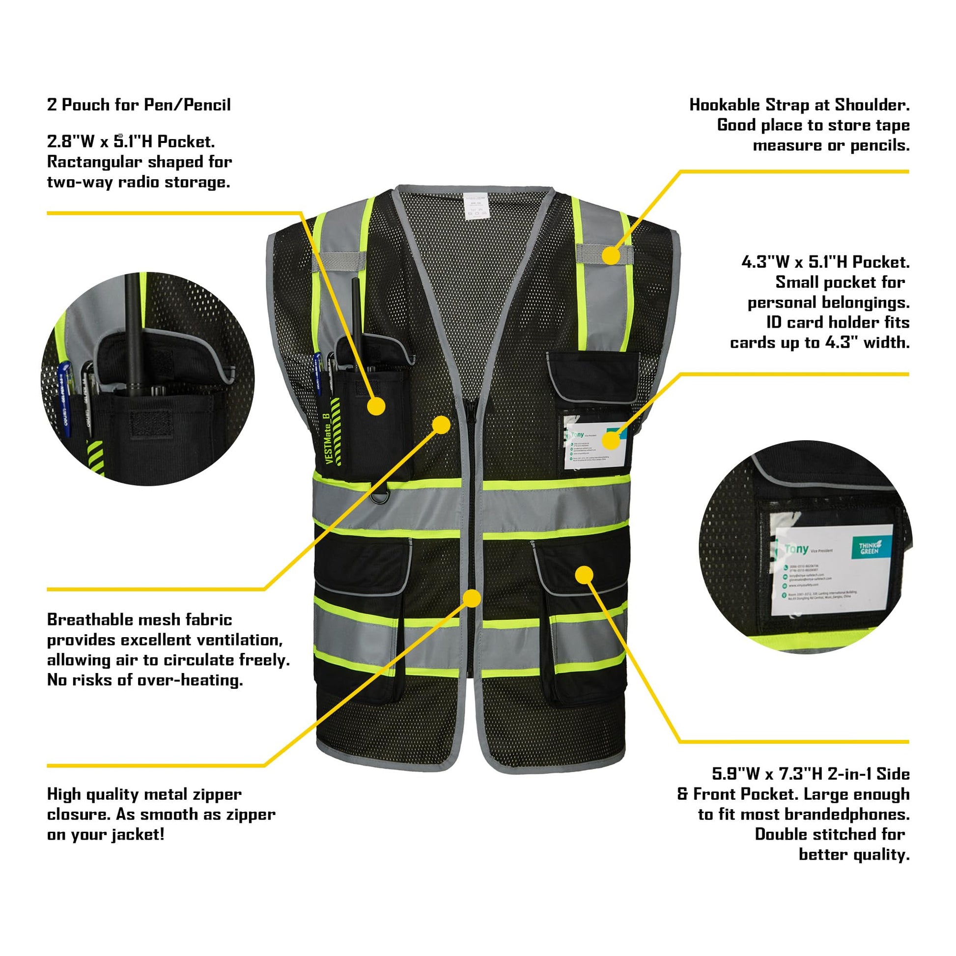 COOLJOB 9 Pockets Reflective Mesh Safety Vest for Men, Hi-vis Work Vest for Construction, Class 2 ANSI Standard, Black X-Large 1 pack