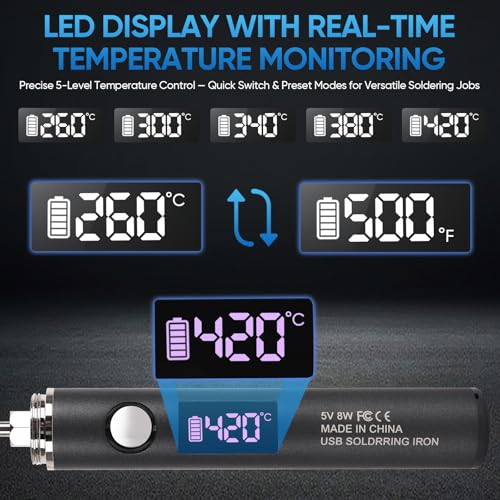 - ¡¼RAPID HEATING & CALIBRATION¡½This portable soldering iron features advanced ceramic heating technology that reaches 260-420¡ÆC (500-788¡ÆF).Real-time temperature calibration ensures consistent heat output during PCB soldering and component replacement.