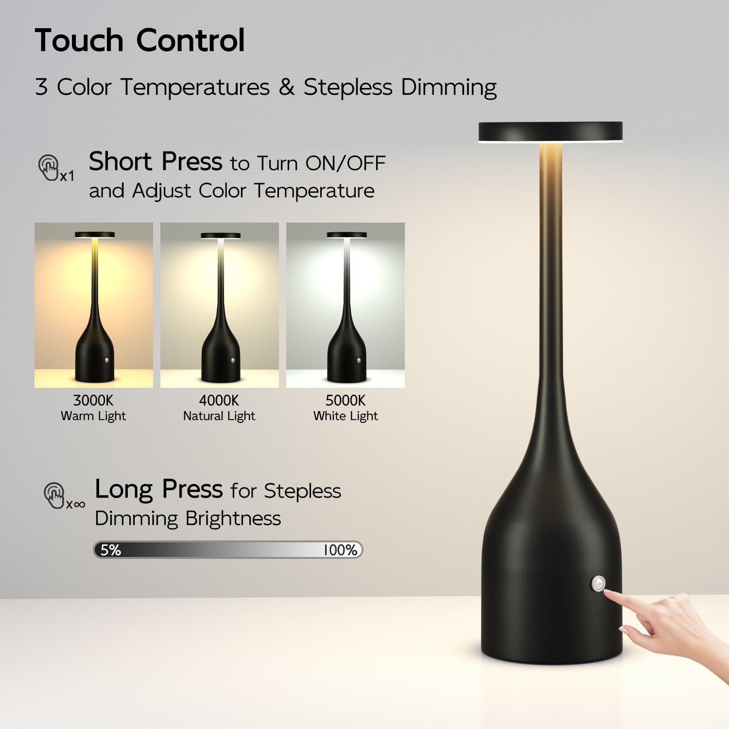 - Dimmable Cordless Lamp: Stepless dimming brightness(100%-3%); Color temperature range: 2700K-4000k-6500K; Switch the light mode by a touch, long press to dim the light brightness
