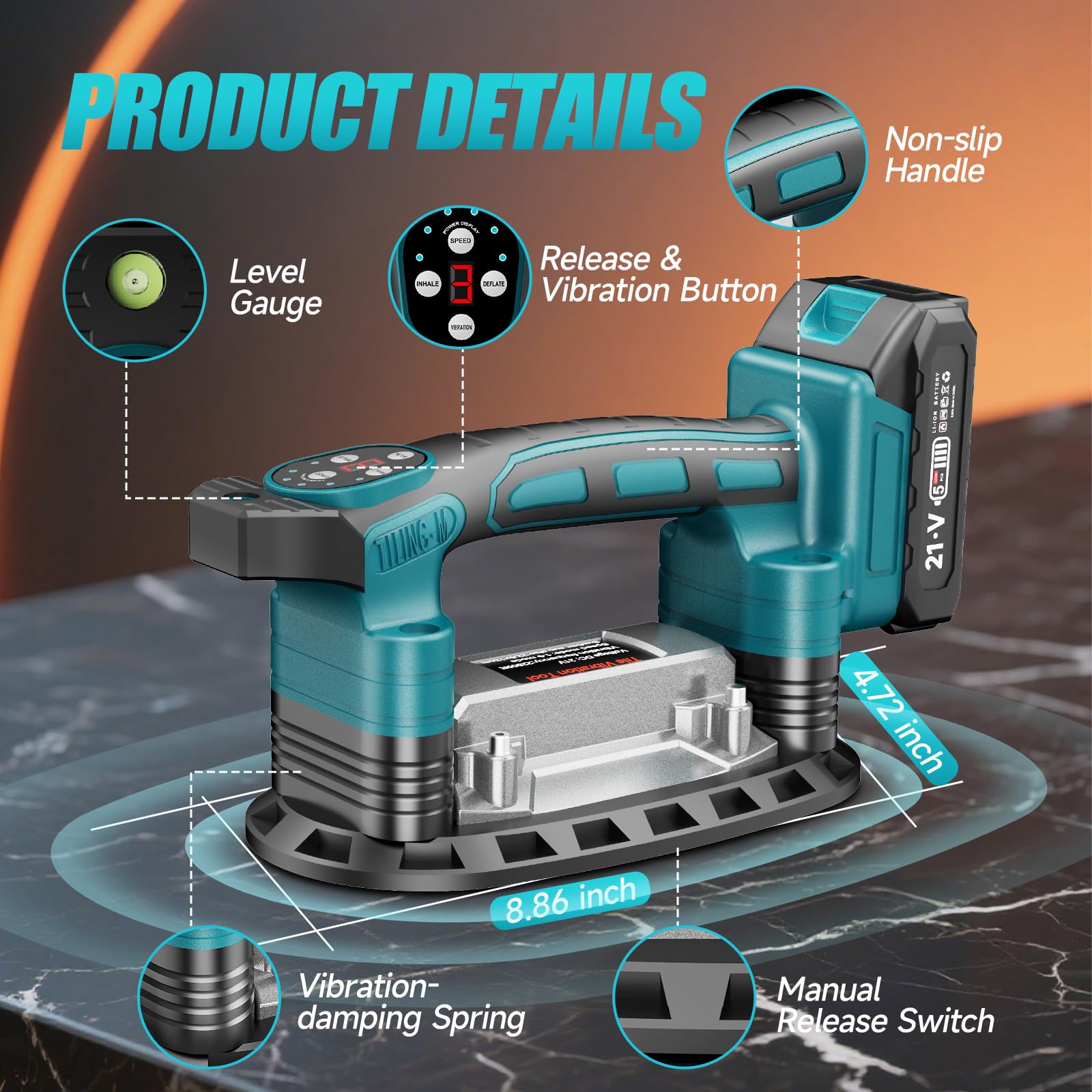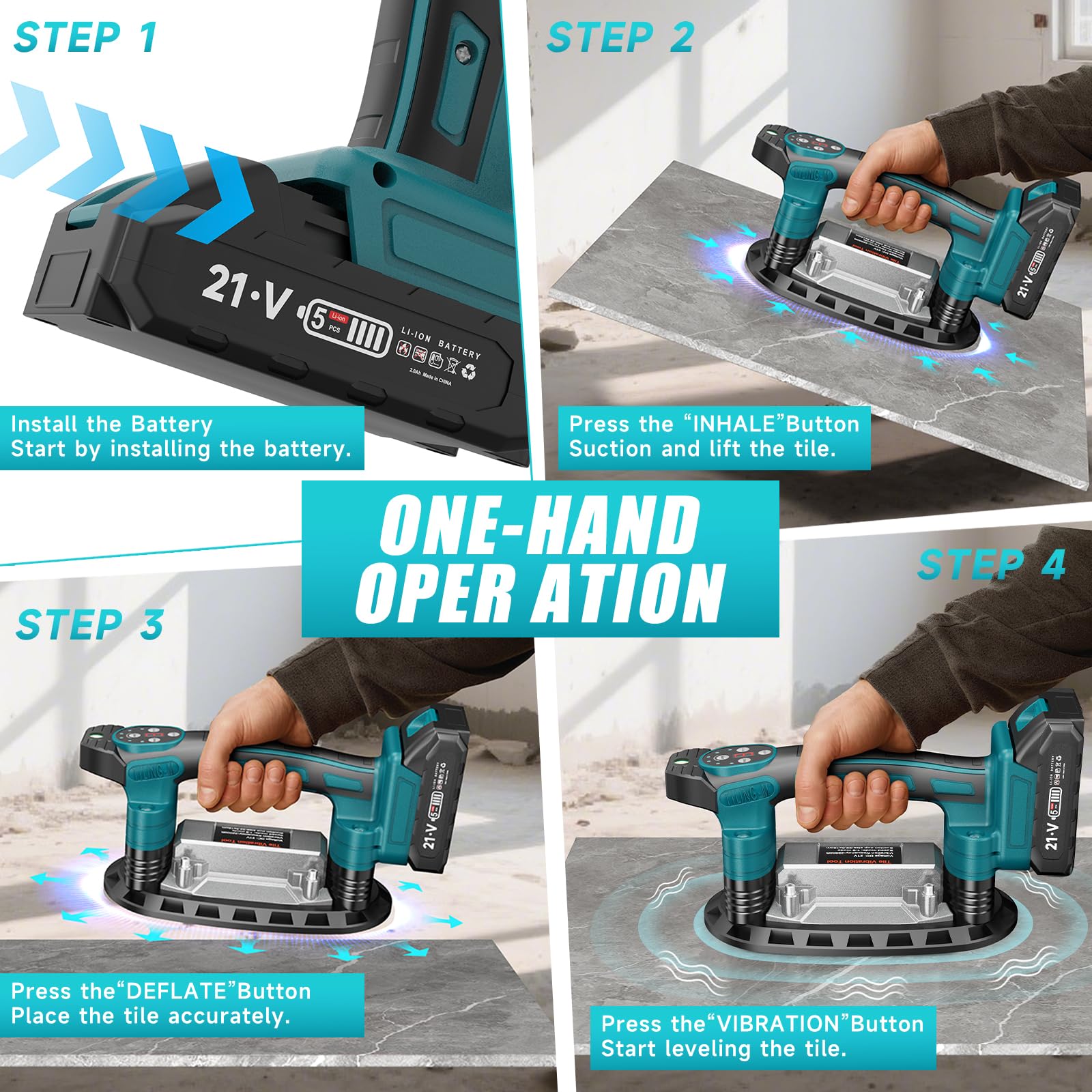 - 【3-IN-1 & 6 Speed Adjustment】: Cordless tile vibration tool combines electric suction, automatic release, and high-frequency vibration in one unit. Simply press a button to lift, place, and level tiles. The tile machine has 6 adjustable speeds, up to 28000 r/min. You can adjust the vibration frequency according to the size and thickness of the tiles to meet your needs.
