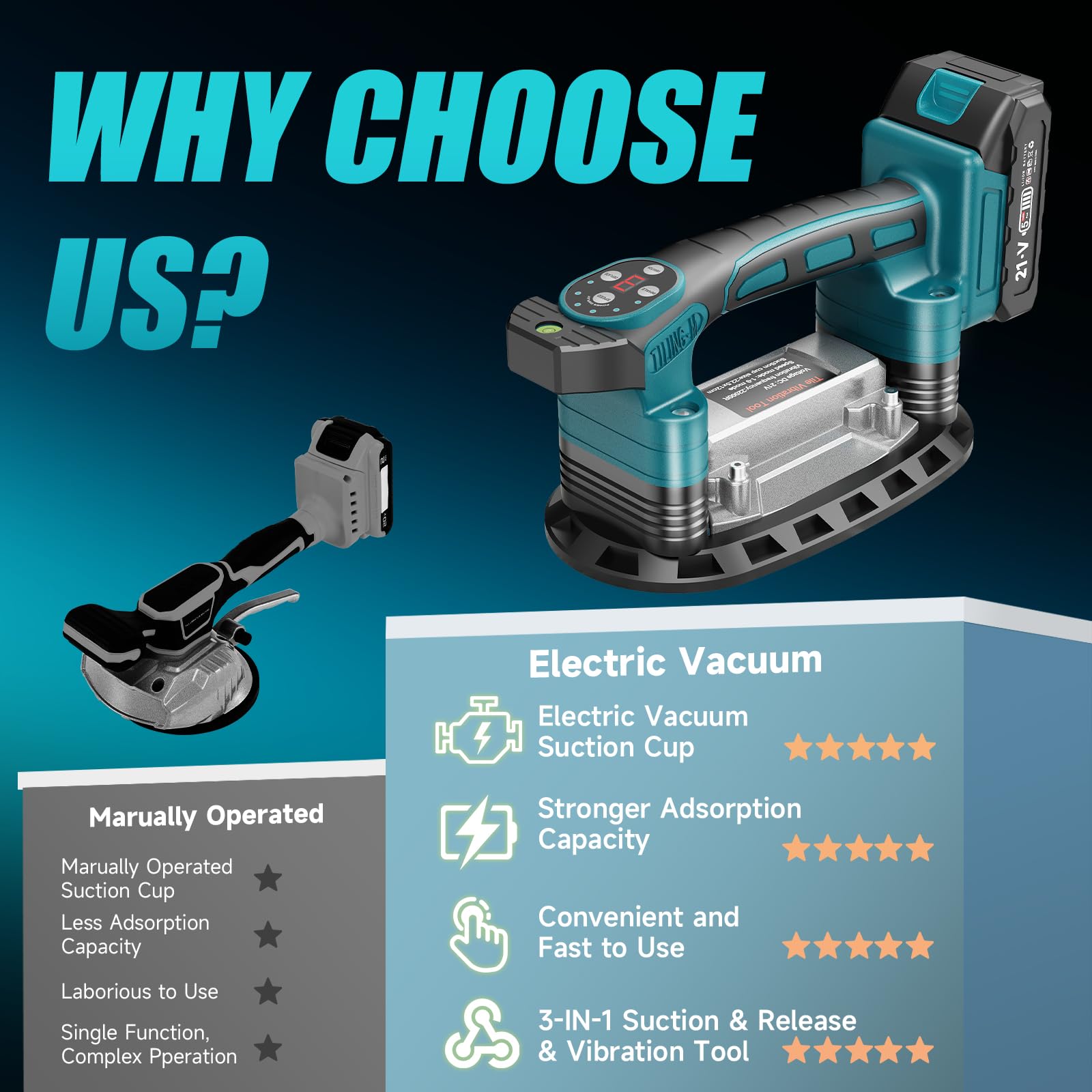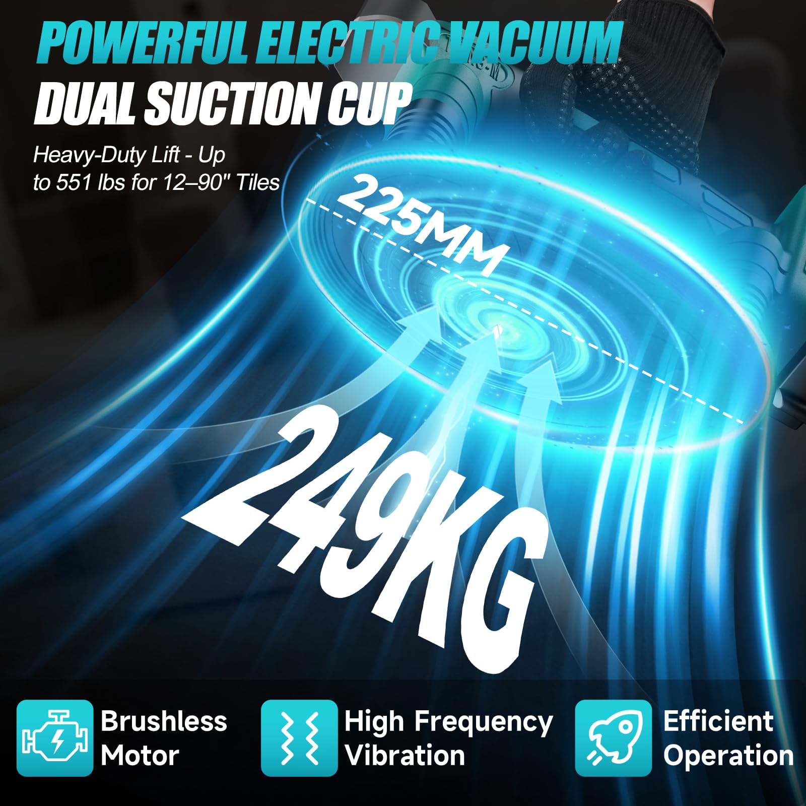 - 【Electric Suction Cup】: Tile vibrator featuring a 225mm oversized double suction cup delivers a strong holding force of up to 249 kg (549 lbs), ensuring tiles remain stable during vibration. The built-in tile suction cup vibrating tool ensures a tight bond, smooth finish, and removes air bubbles. Tips: Always inspect the suction cup for debris and test suction grip prior to lifting.