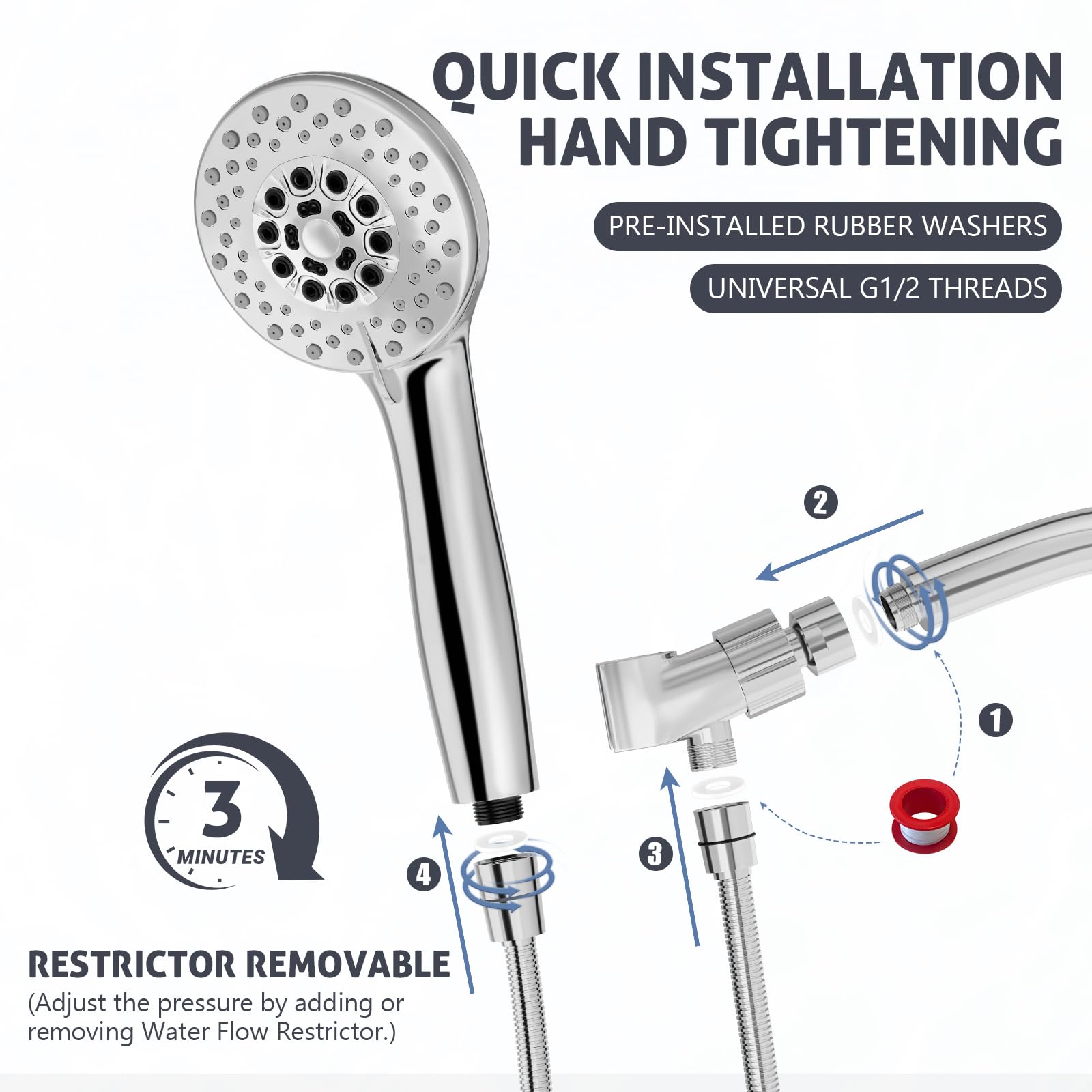 - 【Premium Stainless Steel Hose & Universal Fit】The rust-resistant stainless steel hose ensures durability and kink-free flexibility. With a standard 1/2"" connection, it fits most shower setups effortlessly, replacing old shower heads or handheld units without extra adapters.