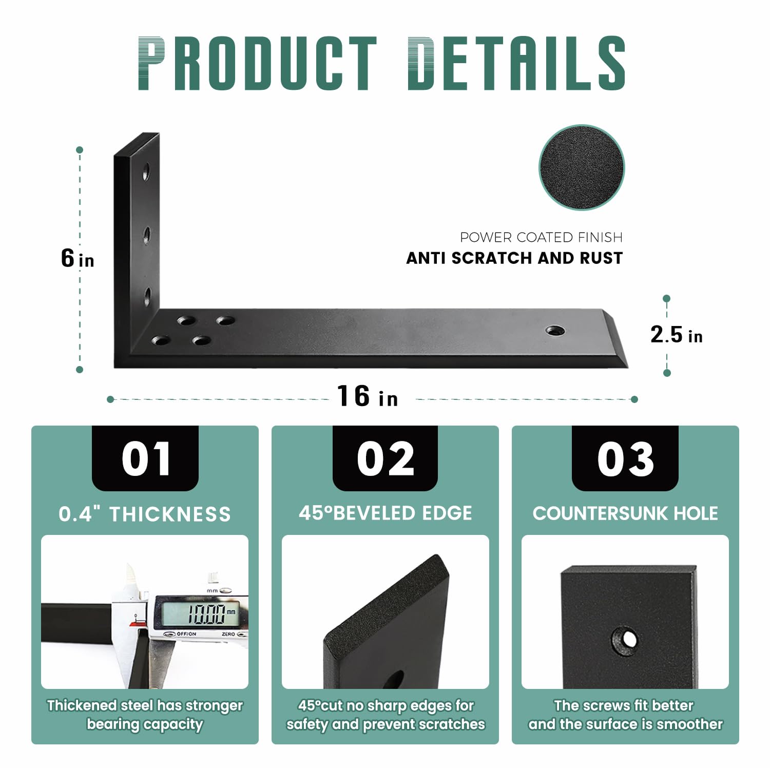 Countertop Support Brackets 4 Pack L Bracket Countertop Brackets 16" x 6" x 2.5" Heavy Duty 3/8" Thick Shelf Brackets Metal Corbels L Shape Bracket for Wood Shelf/Quartz/Granite/Concret Countertops