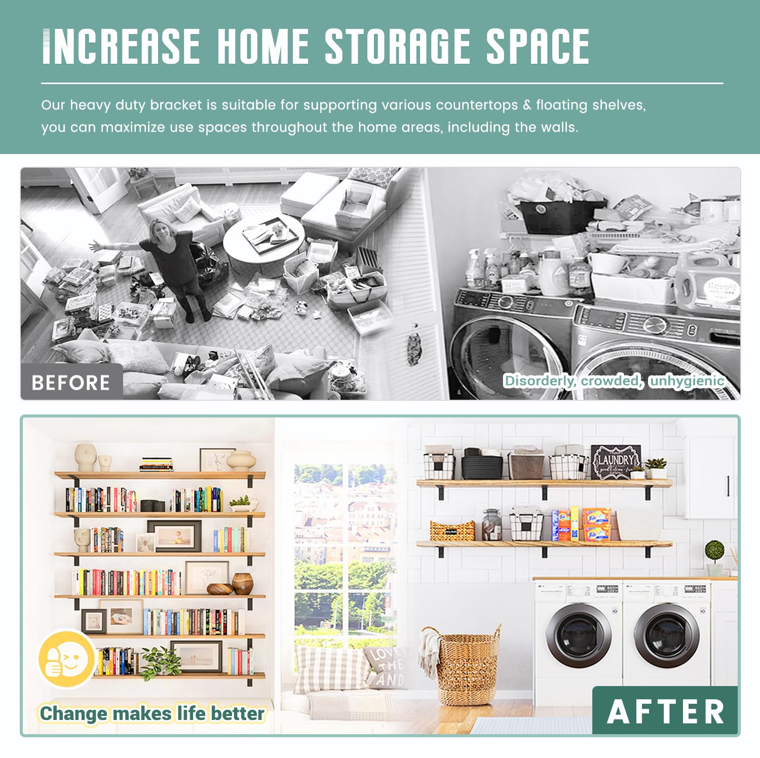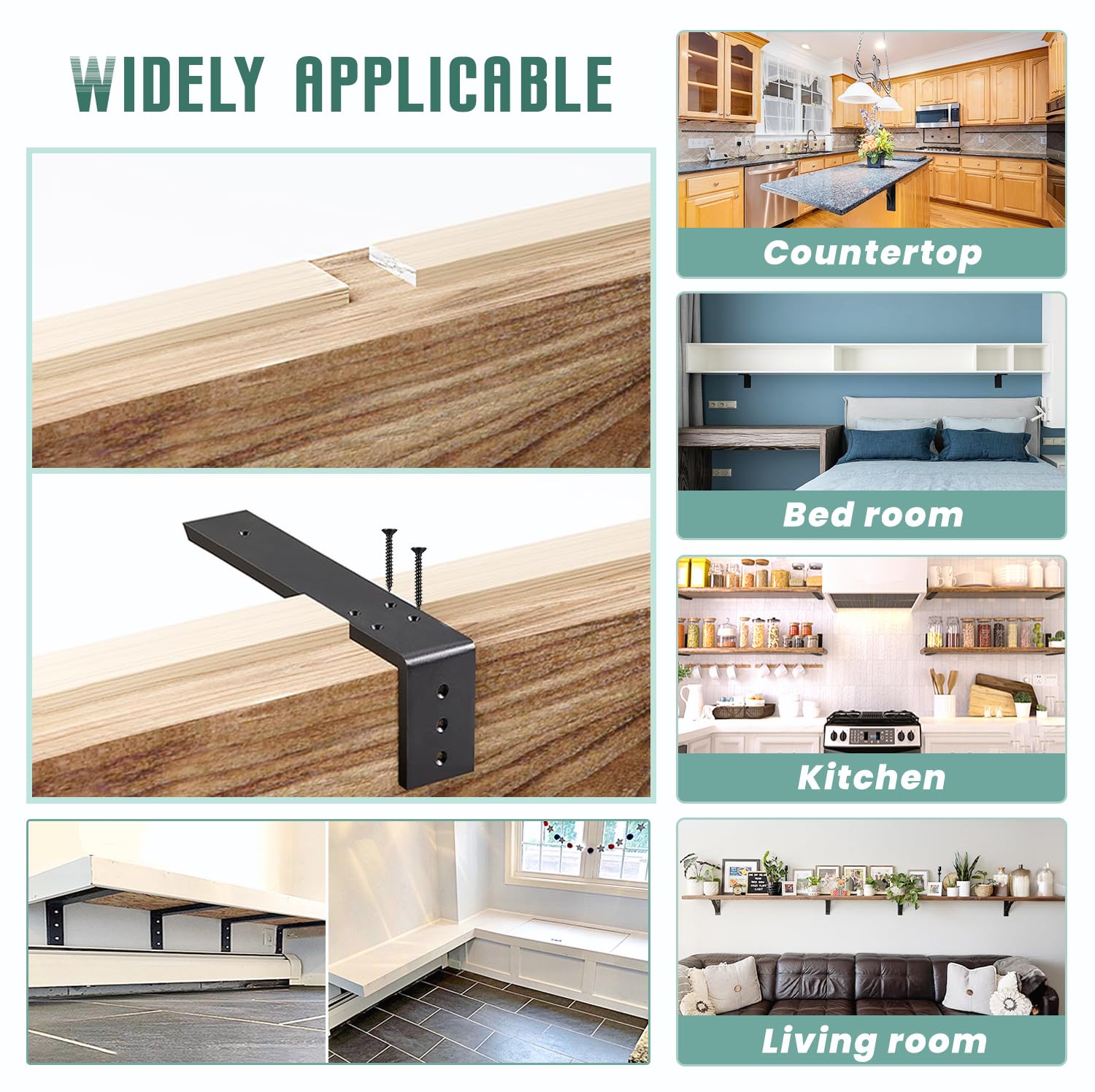 - Thickened Design for Extra Support: Designed to handle heavy loads, these floating shelf brackets feature a 3/8-inch thick vertical side and a 1/2-inch thick horizontal side. The extra thickness and the included lag screws enhances the stability of your countertop, ensuring it remains secure under substantial weight. The countertop brackets can support about 250lb per pair once installed properly, are perfect for solid-surface countertops, giving you peace of mind with their reliability.