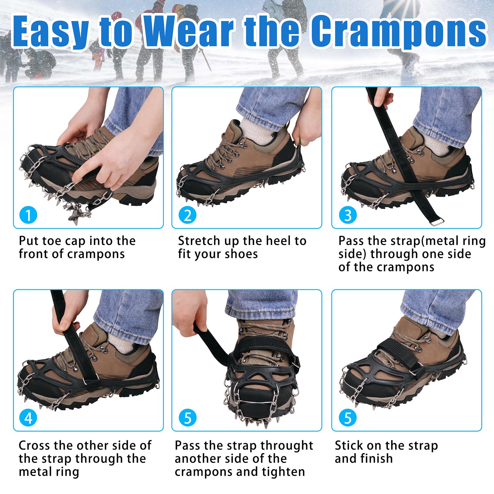 - 【STRONG SPIKES】Crampons features 19 enhanced multi-directional abrasion-resistant stainless steel spikes per feet, can dig into and provides excellent traction on a variety of icy surfaces, reducing the risk of slips and falls in even the toughest conditions