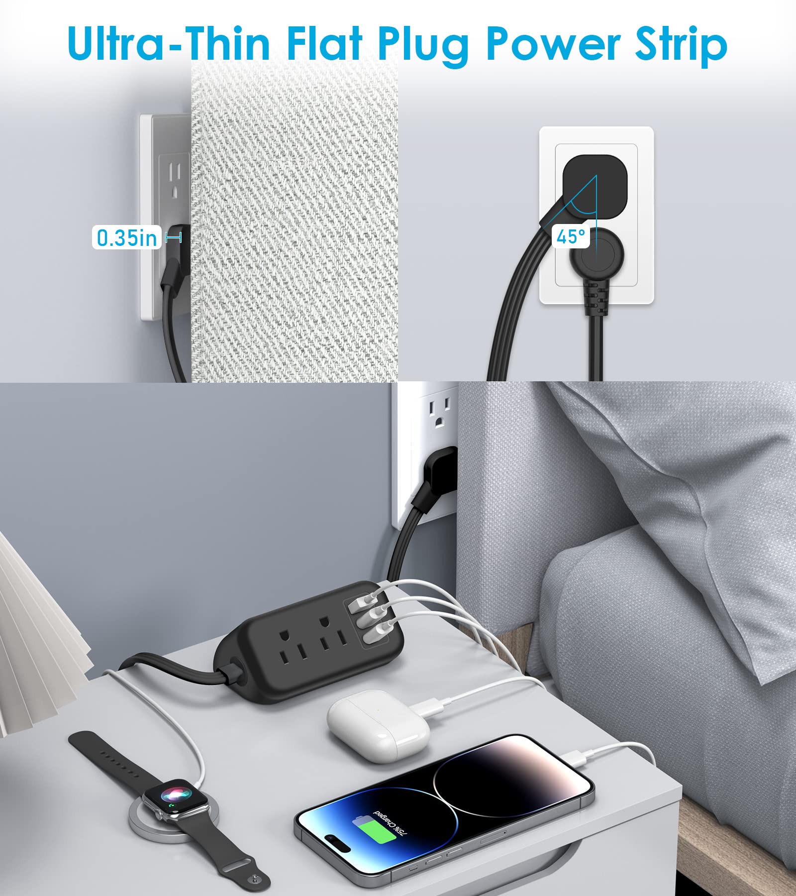 Cruise Ship Essentials - 30W USB CTravel Power Strip Flat Plug, 3 Ft Flat Extension Cord with 4 Outlets 3 USB Ports(2 USB C), Small Power Strip No Surge Protection for Cruise Travel Home Office
