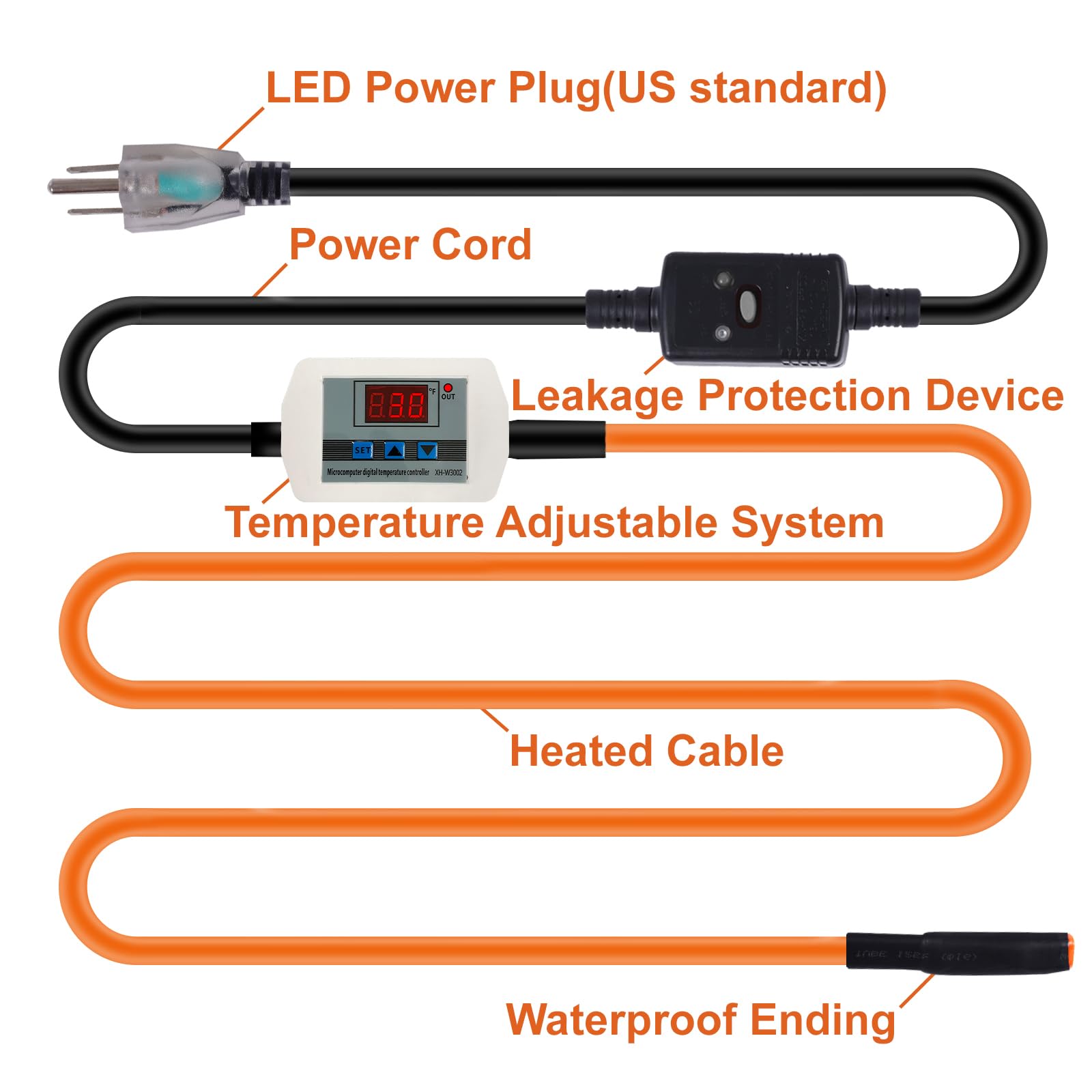 - Easy Installation: All you need to do is lay our heating tape straight or wrap it around the water pipe and secure it with the supplied fiberglass tape; and if you want to test it, please put the thermostat in ice water, plug it in, wait for a few minutes you can feel the cable heating up