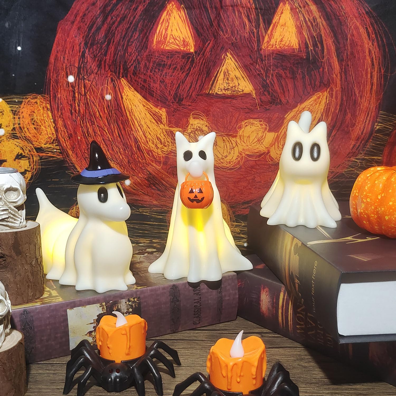 Cute Halloween Decorations Indoor, Ghost Dogs and Ghost Cat Halloween Decor with Witch Hat for Home Kitchen Mantel Tabletop Decor