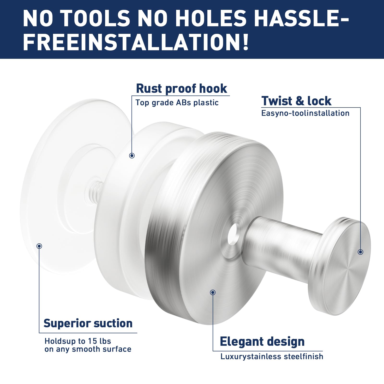 - ★【Effortless Setup in 3 Steps】These suction cup hooks for shower no need to drill holes in the wall, easy to install in just 3 steps! 1. Choose and clean a smooth, non-porous surface. 2. Loosen the hook counter-clockwise. 3. Peel off the film,press the base against the surface and twist the hook clockwise until fully tight. Wait 24 hours and you can start using it.For specific installation steps, please refer to our installation instructions