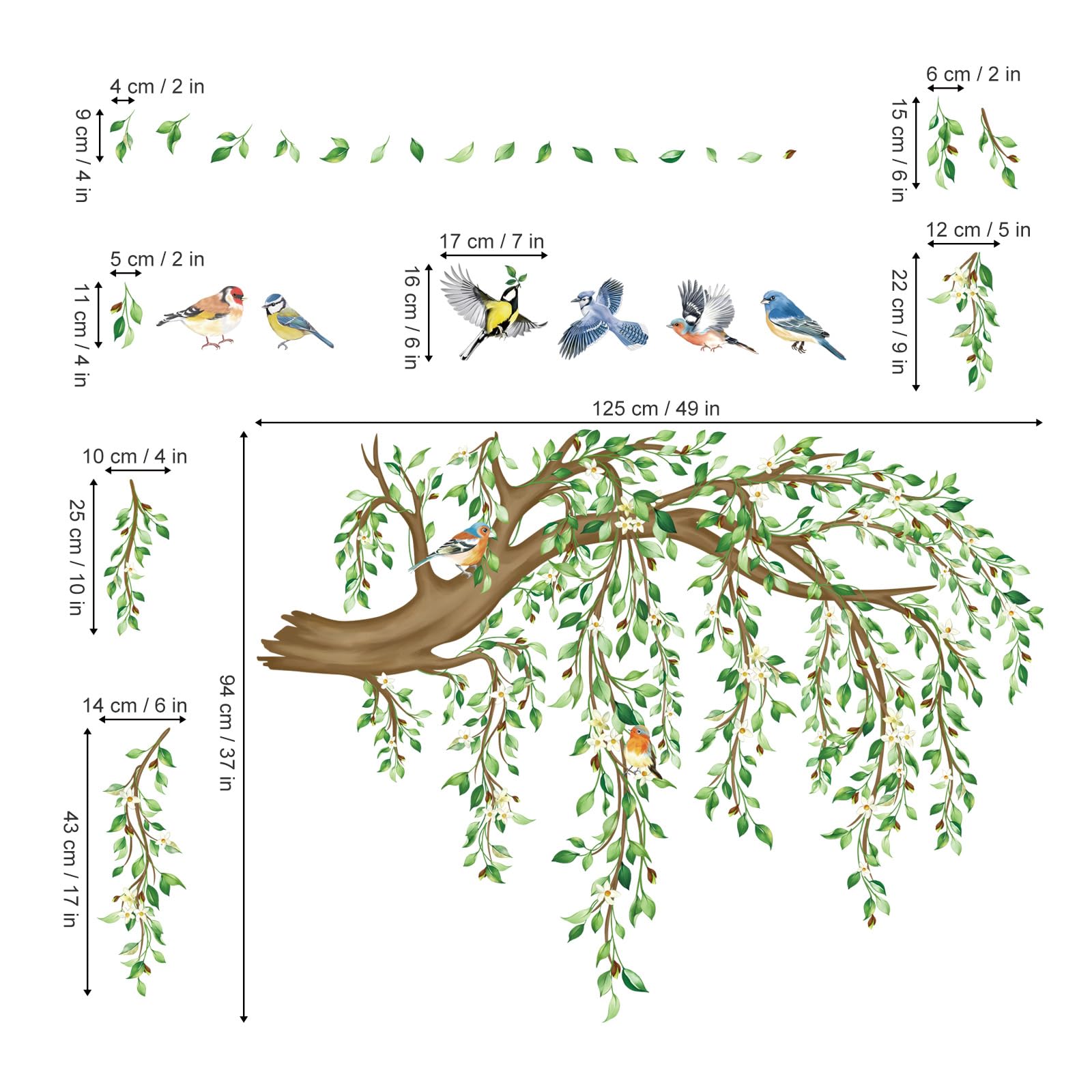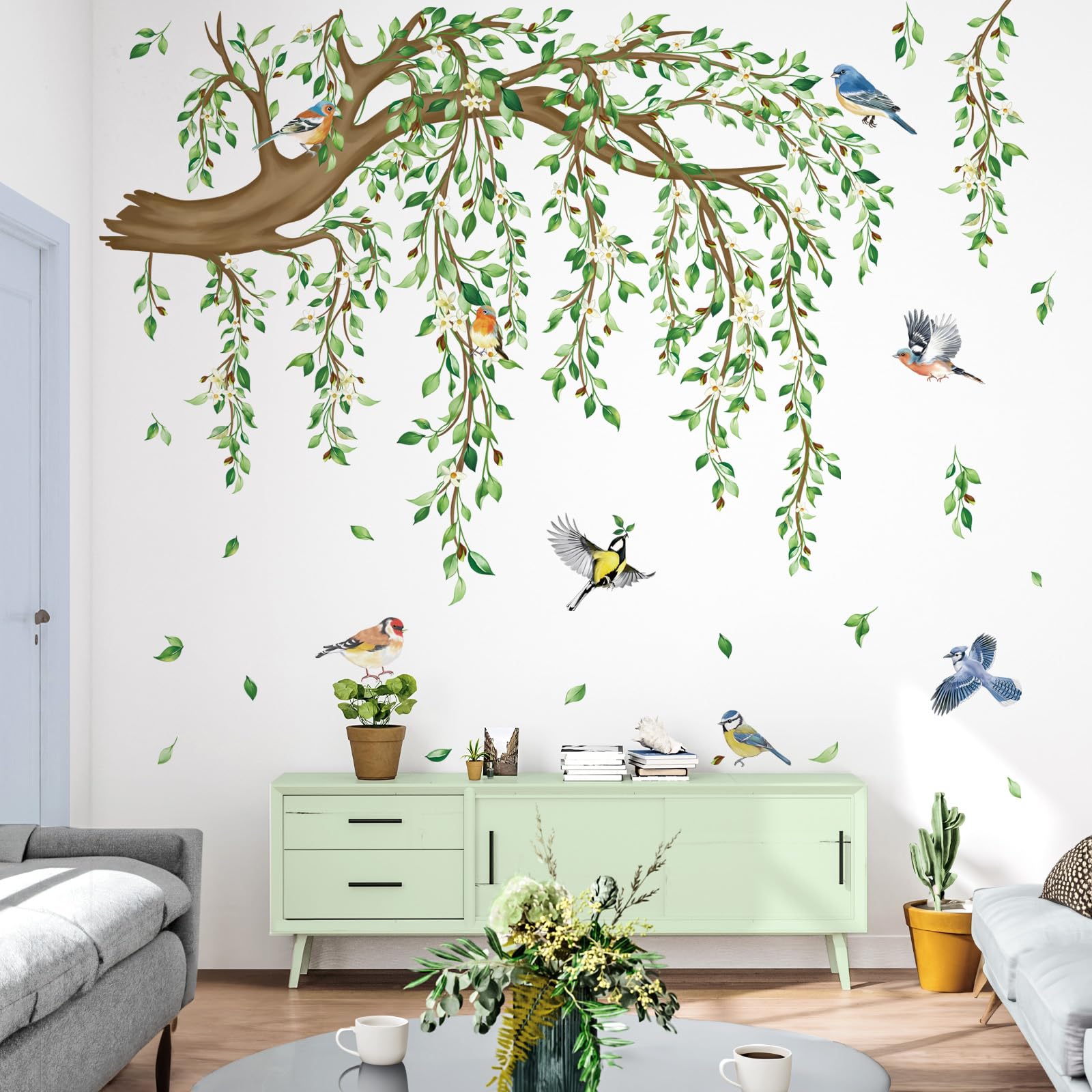 decalmile Large Hanging Vine Wall Decals Tree Branch Green Leaf Flower Birds Wall Stickers Living Room Tv Background Bedroom Wall Decor
