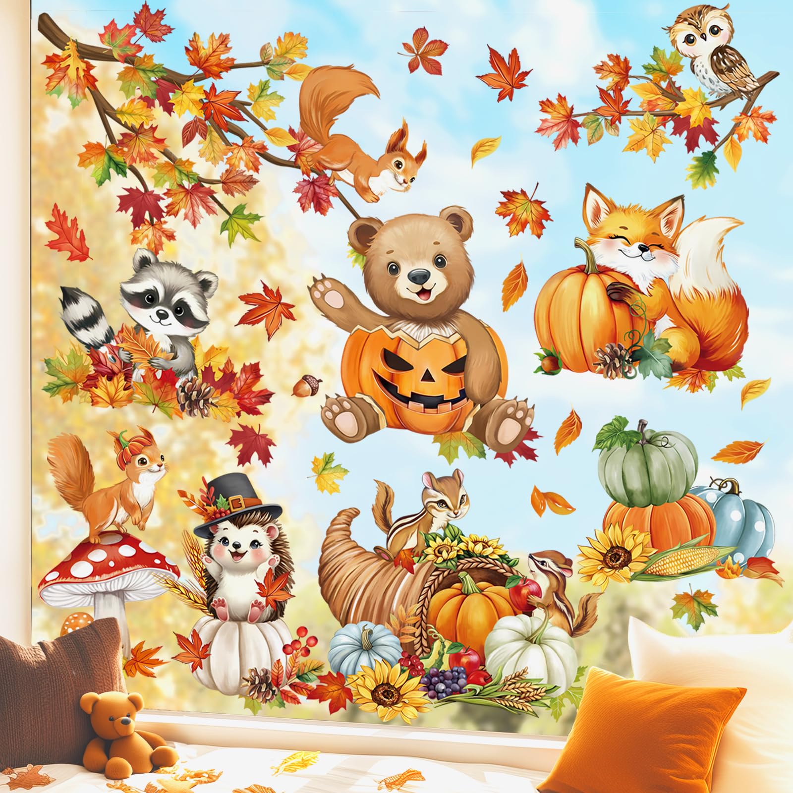 decalmile Woodland Animals Fall Pumpkin Double Sided Window Clings Thanksgiving Autumn Harvest Bear Fox Racoon Anti-Collision Glass Doors Window Stickers Decals